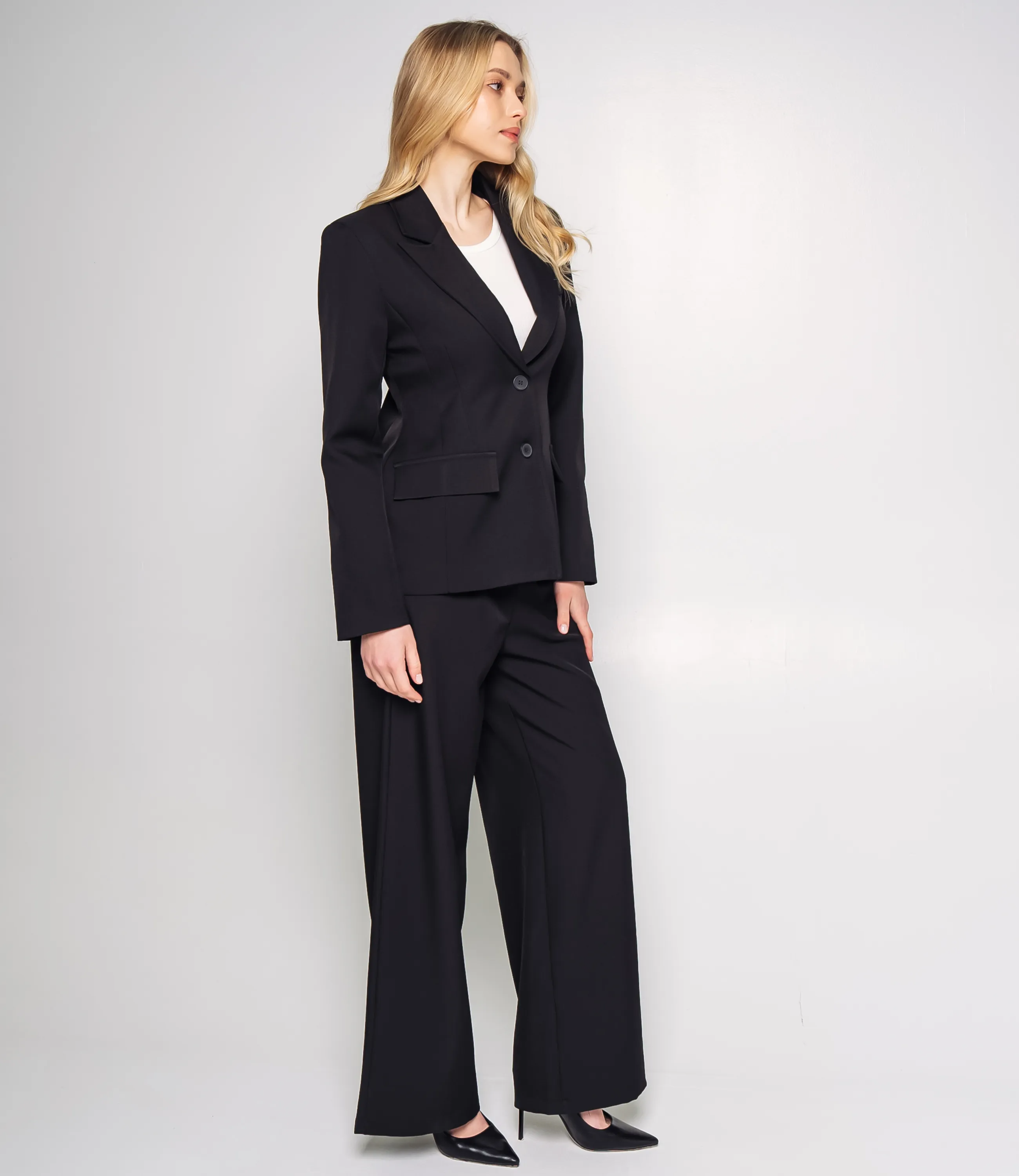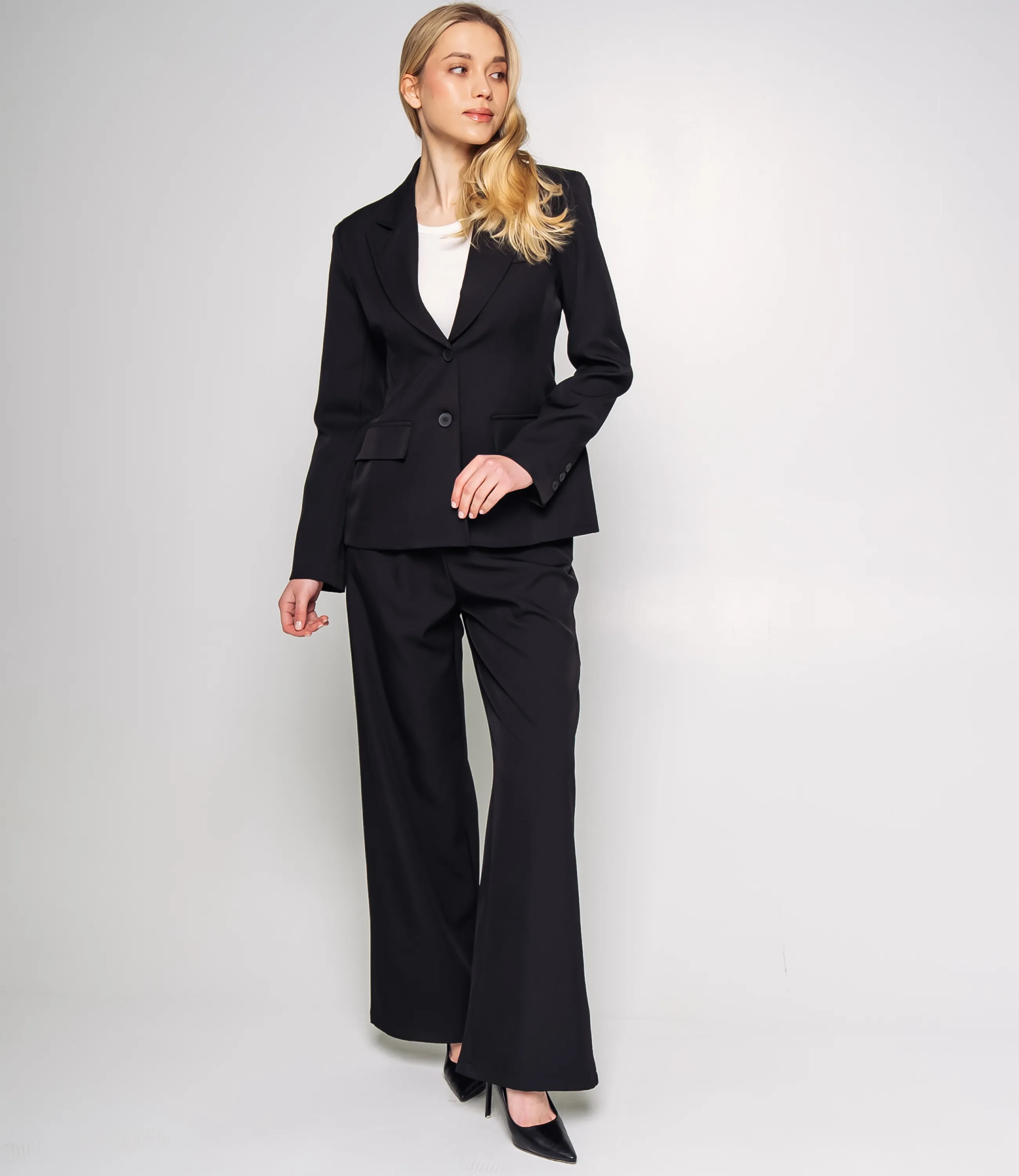 Костюм – это одежда, которая подчеркивает стиль и комфорт каждой женщины. Костюм состоит из жакета однобортный с заострёнными лацканами, лёгким приталиванием, структурированными плечами, рукавами до запястья и застёжкой на две пуговицы. Брюки с втачным поясом и скрытой застёжкой, облегающие бёдра и плавно расширяющиеся к низу в широкую штанину. Для изготовления использованы ткани 65% полиэстер и 35% хлопок, который характеризуются отличным качеством и дышащими свойствами. Даже после множества стирок изделие не утратит первоначальной красоты. Вы будете носить его с радостью. Обратите внимание на цвет. Он полностью соответствуют фотографии на сайте. Чтобы вы были уверены в размере, мы представили на странице таблицу. Воспользовавшись ею, вы сможете сами обмерить себя и удостовериться. Установленная нами цена является приемлемой. Не откажите себе в удовольствии быть стильной и комфортной!