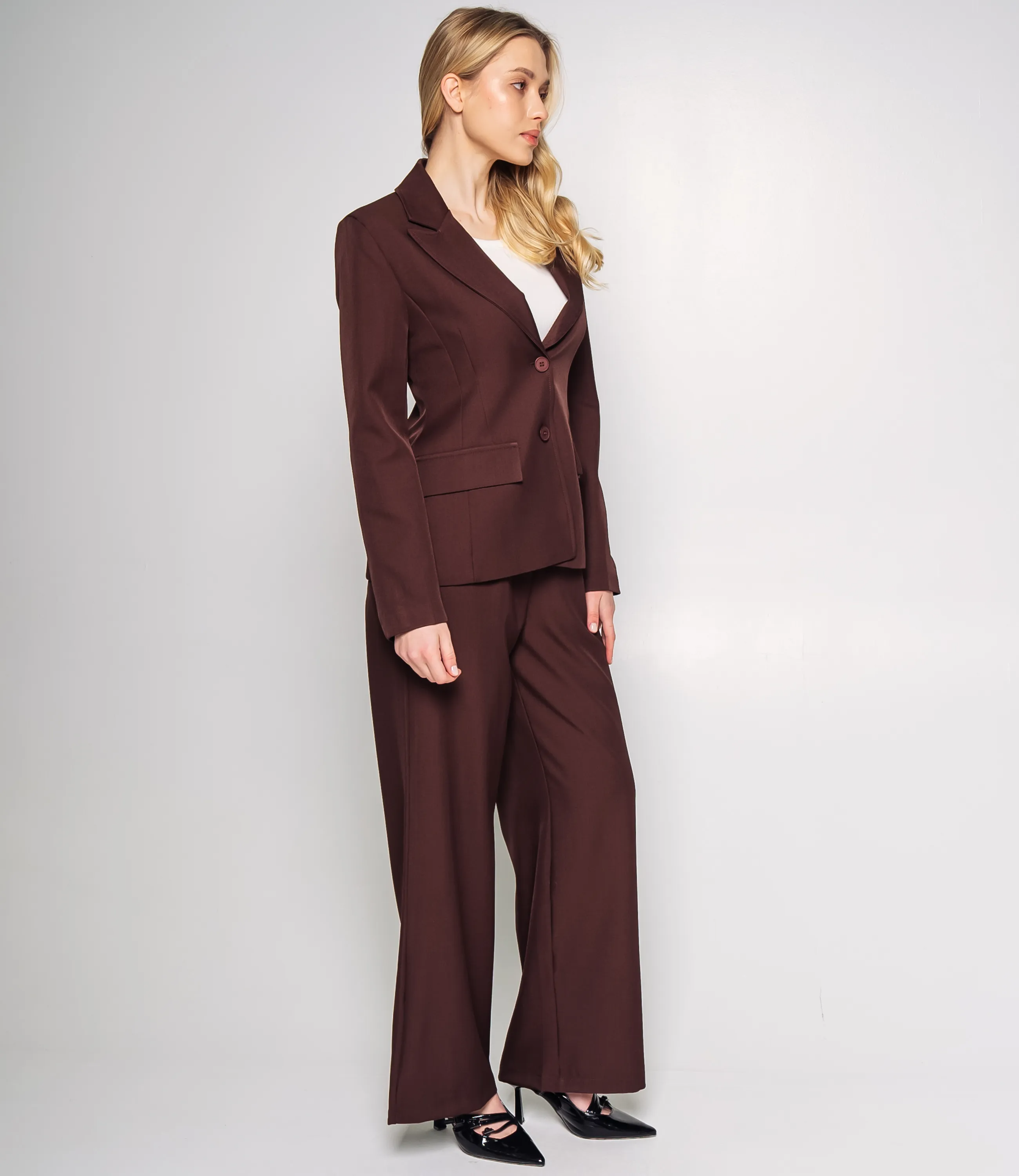 Костюм – это одежда, которая подчеркивает стиль и комфорт каждой женщины. Костюм состоит из жакета однобортный с заострёнными лацканами, лёгким приталиванием, структурированными плечами, рукавами до запястья и застёжкой на две пуговицы. Брюки с втачным поясом и скрытой застёжкой, облегающие бёдра и плавно расширяющиеся к низу в широкую штанину. Для изготовления использованы ткани 65% полиэстер и 35% хлопок, который характеризуются отличным качеством и дышащими свойствами. Даже после множества стирок изделие не утратит первоначальной красоты. Вы будете носить его с радостью. Обратите внимание на цвет. Он полностью соответствуют фотографии на сайте. Чтобы вы были уверены в размере, мы представили на странице таблицу. Воспользовавшись ею, вы сможете сами обмерить себя и удостовериться. Установленная нами цена является приемлемой. Не откажите себе в удовольствии быть стильной и комфортной!