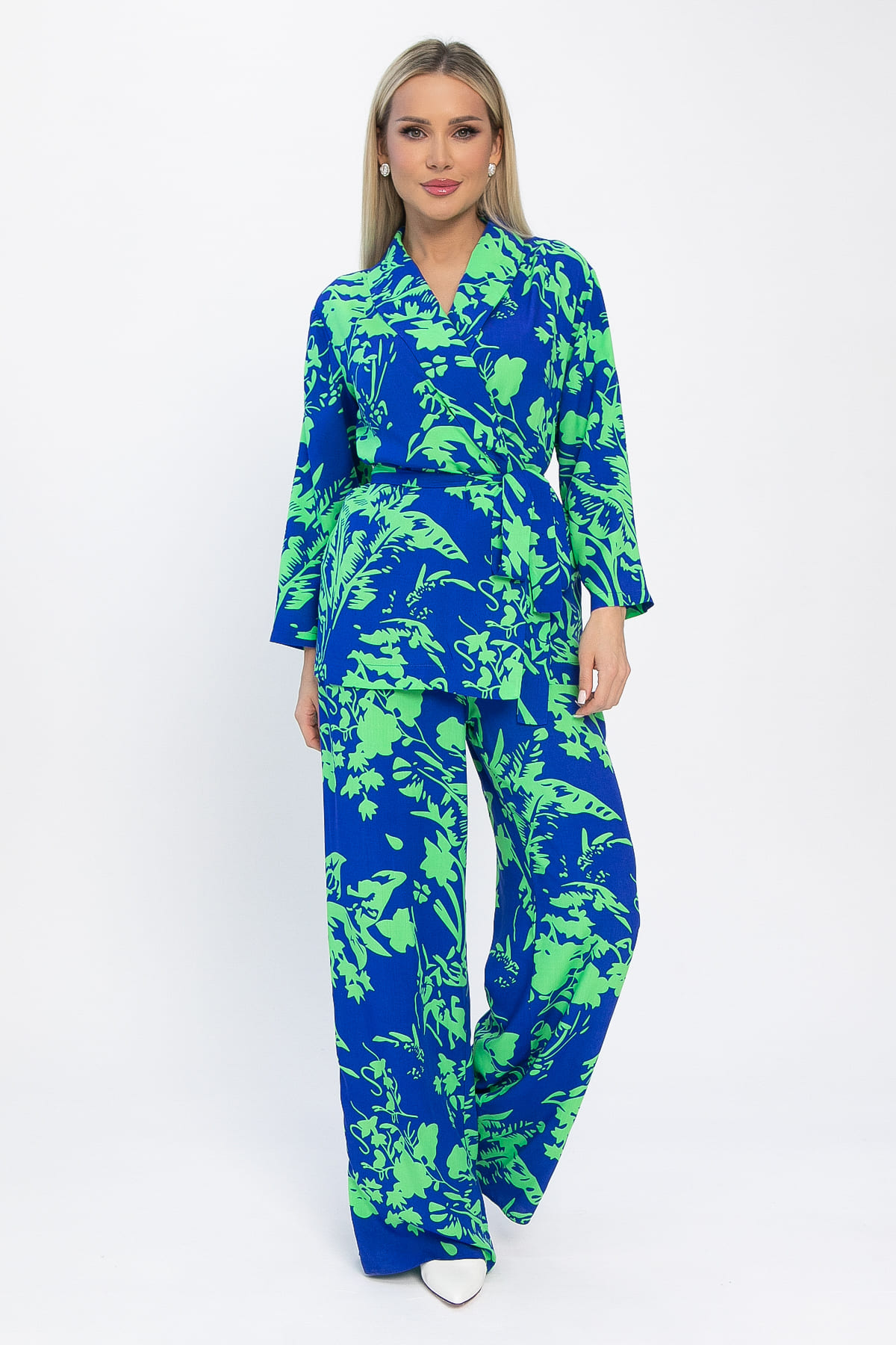 Костюм из лёгкой тканиидеально подойдёт для летнего расслабленного образа. Свободный крой не сковывает движений и дарит комфорт. Рукав три четверти, со спущенным плечевым швом. В комплект входит пояс из основной ткани, который позволит подчеркнуть преимущества фигуры.