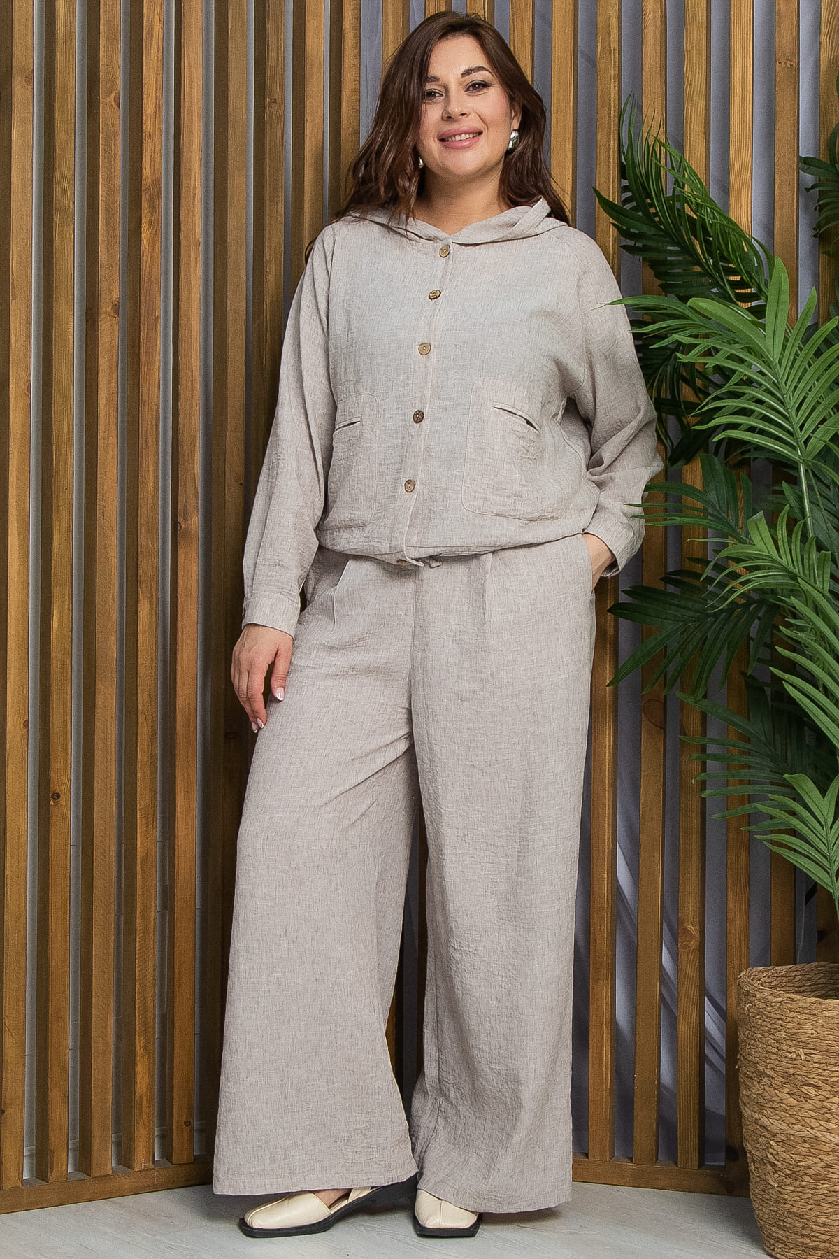 Костюм свободного кроя в бежевом цвете — отличное решение для комфортных и стильных образов. Верх с капюшоном и пуговицами удобен и практичен. Пояс с кулиской позволяет регулировать посадку. Рукава-реглан с манжетами на пуговицах, спереди два накладных кармана с прорезным входом в рамку. Брюки прямого кроя имеют притачной пояс на резинке сзади, застежку на молнию и пуговицу. На передней части брюк — пять защипов с каждой стороны, боковые швы скрывают карманы, а на заднем полотнище есть имитация карманов. Этот костюм станет стильным и удобным дополнением вашего гардероба!