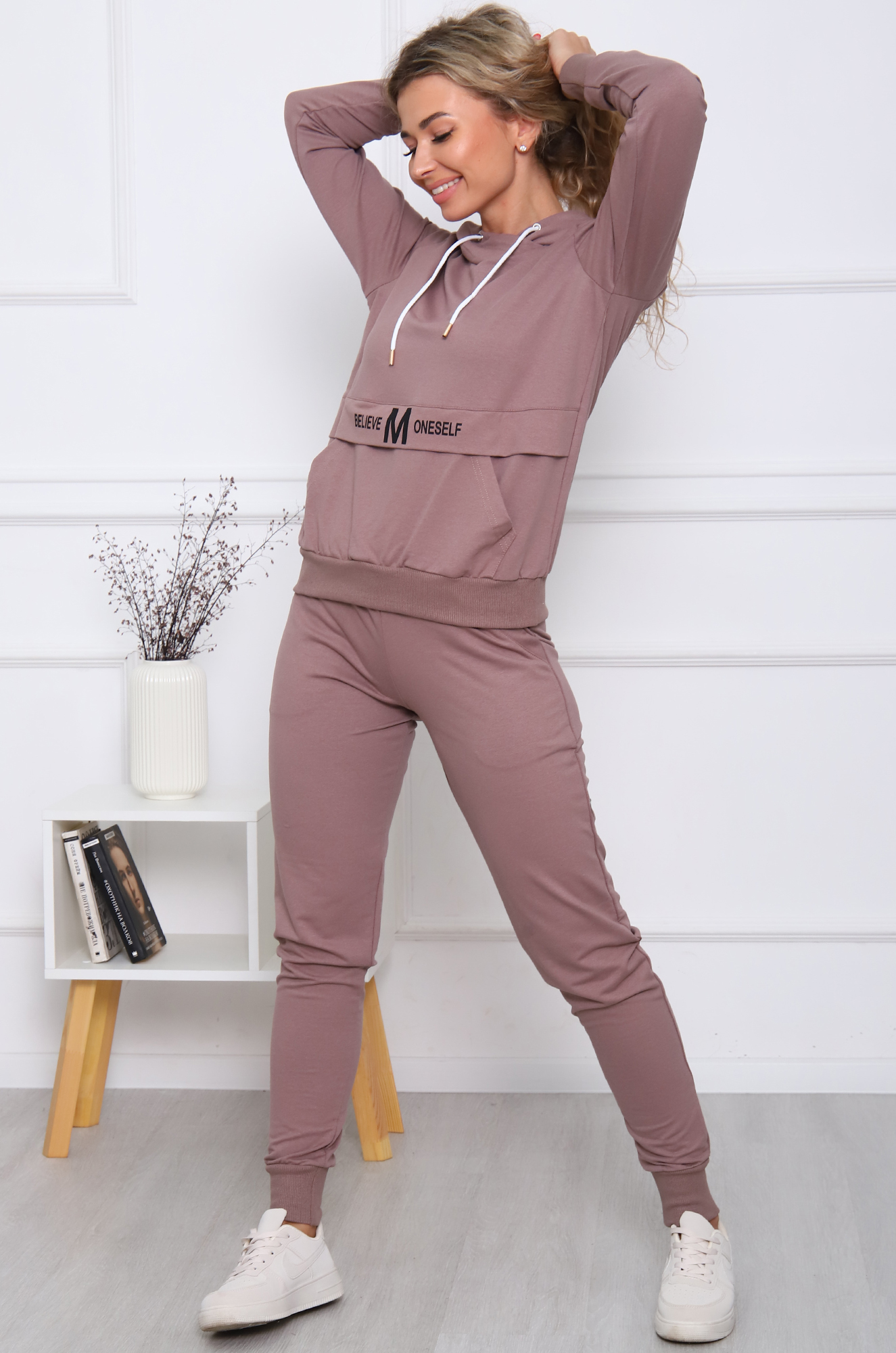 Брюки зауженной модели, снизу на манжете, пояс на широкой резинке, по бокам - карманы. Дополняет модель печатный принт на толстовке.
