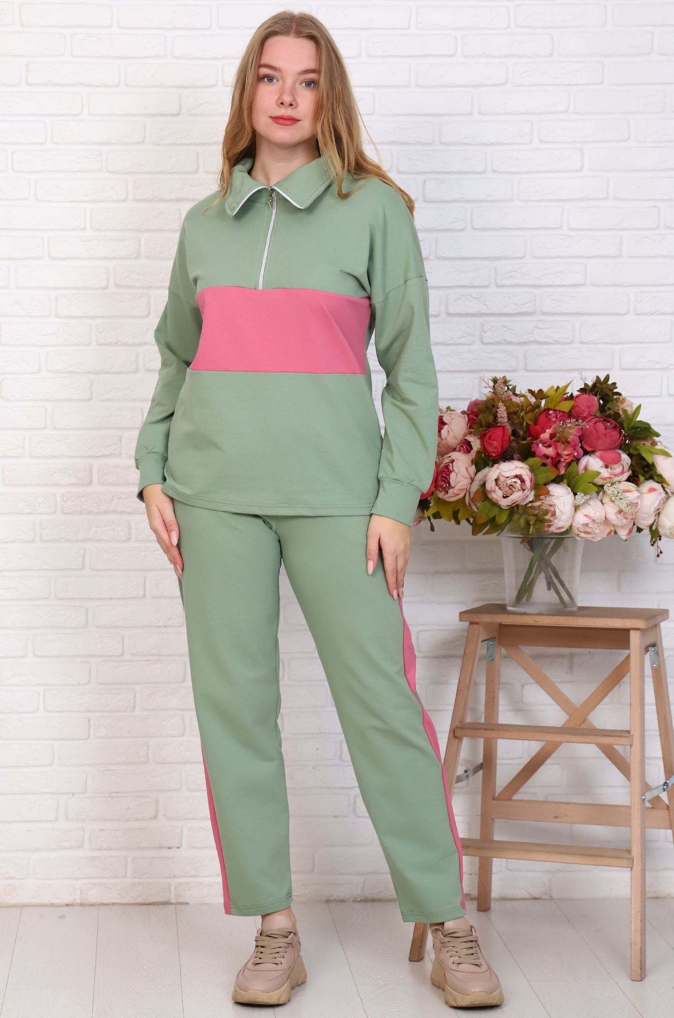Удобный спортивный женский костюм на все случаи жизни! Толстовка прямого кроя, с комбинированной вставкой на полочке, воротник-стойка на короткой молнии. Брюки с широкими лампасами, слегка зауженные книзу, пояс на широкой резинке. Ткань футер с лайкрой - эластичный, приятный к телу и практичный в эксплуатации.