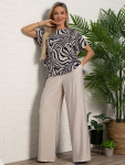 Костюм подходит как для повседневных выходов, так и для особых случаев. Брюки прямого кроя, на резинке по талии, с воланом сбоку. Удобный и стильный дизайн идеально подойдет для повседневной носки. Блуза с коротким и цельнокроеным рукавом, идеально дополняет брюки и создает завершенный образ. Легкая и комфортная ткань обеспечит вам комфорт в течение дня.