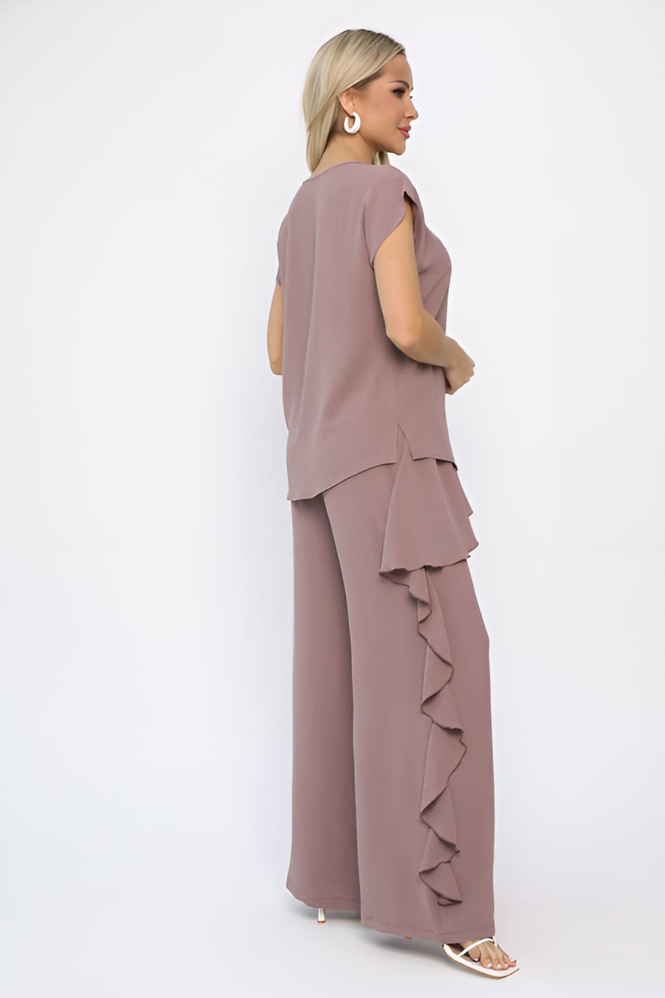 Костюм подходит как для повседневных выходов, так и для особых случаев. Брюки прямого кроя, на резинке по талии, с воланом сбоку. Удобный и стильный дизайн идеально подойдет для повседневной носки. Блуза с коротким и цельнокроеным рукавом, идеально дополняет брюки и создает завершенный образ. Легкая и комфортная ткань обеспечит вам комфорт в течение дня.
