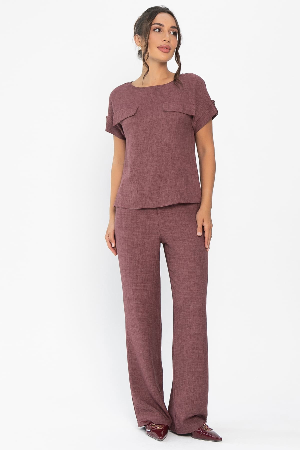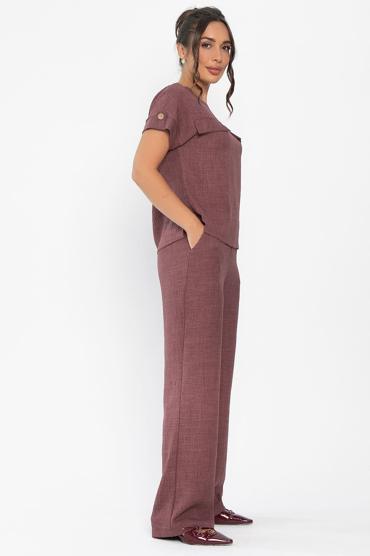 В этом костюме вы будете чувствовать себя уверенно и комфортно. Сочетание элегантности и практичности в одном изделии. Представляем вашему вниманию костюм-двойку, который станет идеальным дополнением к вашему гардеробу. Он состоит из стильного верха прямого кроя и удобных брюк. Верх изделия имеет цельнокроеные рукава с патами и пуговицами, а также оригинальные клапаны на уровне груди, которые придают образу изысканность. Брюки классического кроя на резинке по талии и с карманами в боковых швах подойдут как для деловых встреч, так и для повседневных выходов.