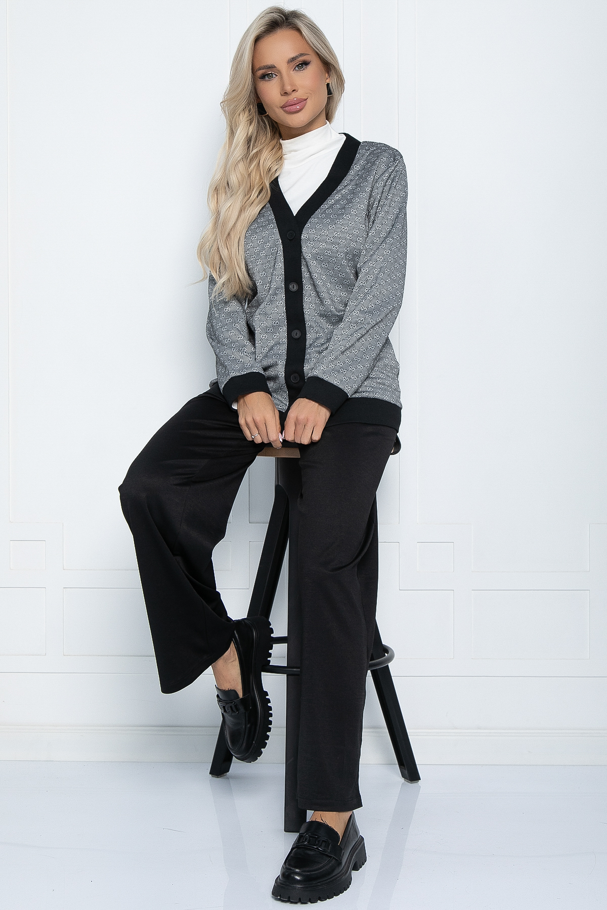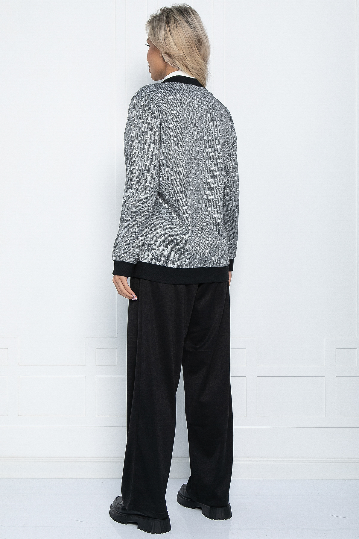 Костюм-двойка, состоящий из классических брюк прямого кроя и свободного жакета стрендовым принтом. Брюки на молнии спереди, сзади талия на резинке, в боковых швах есть карманы. В таком трикотажном костюме можно смело отправиться на прогулку или на встречу с друзьями. Целый день вам будет уютно и комфортно.