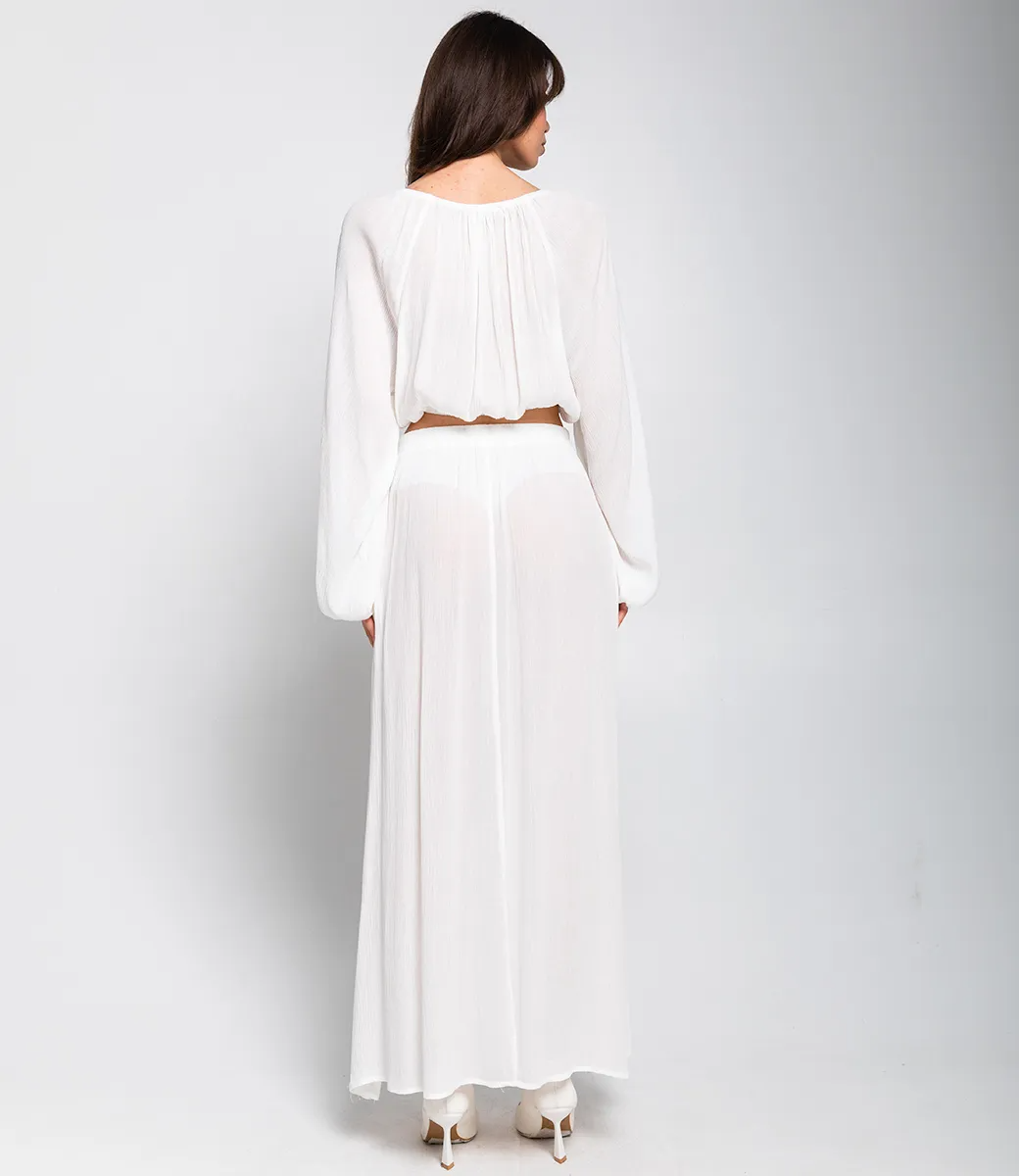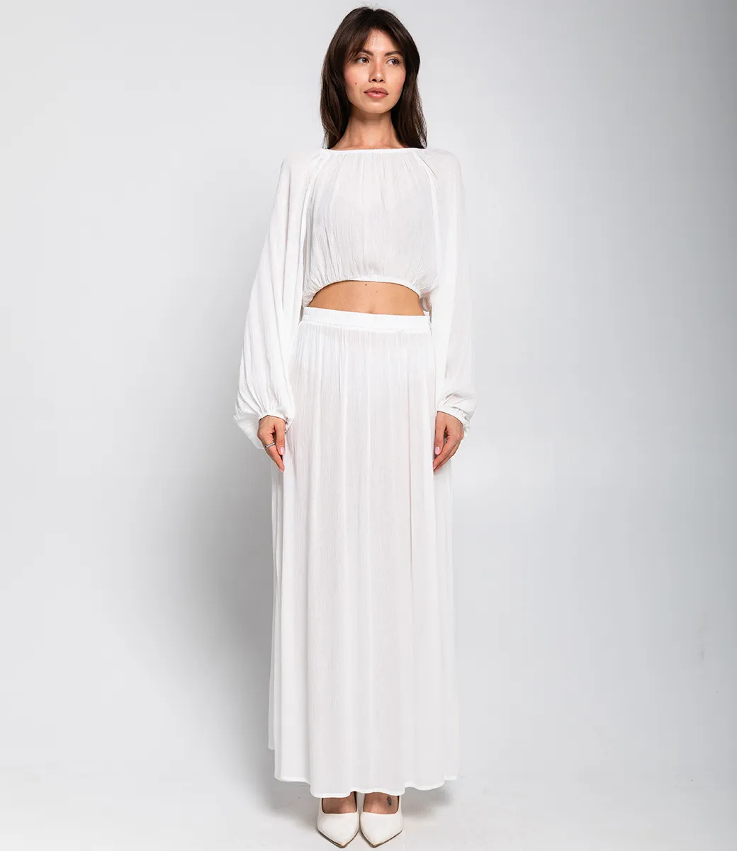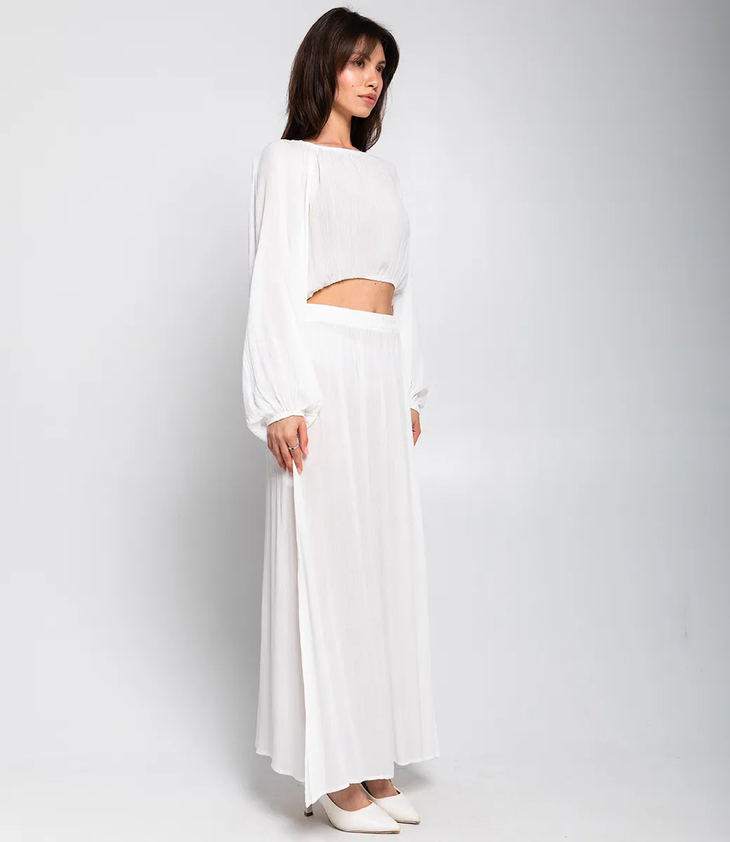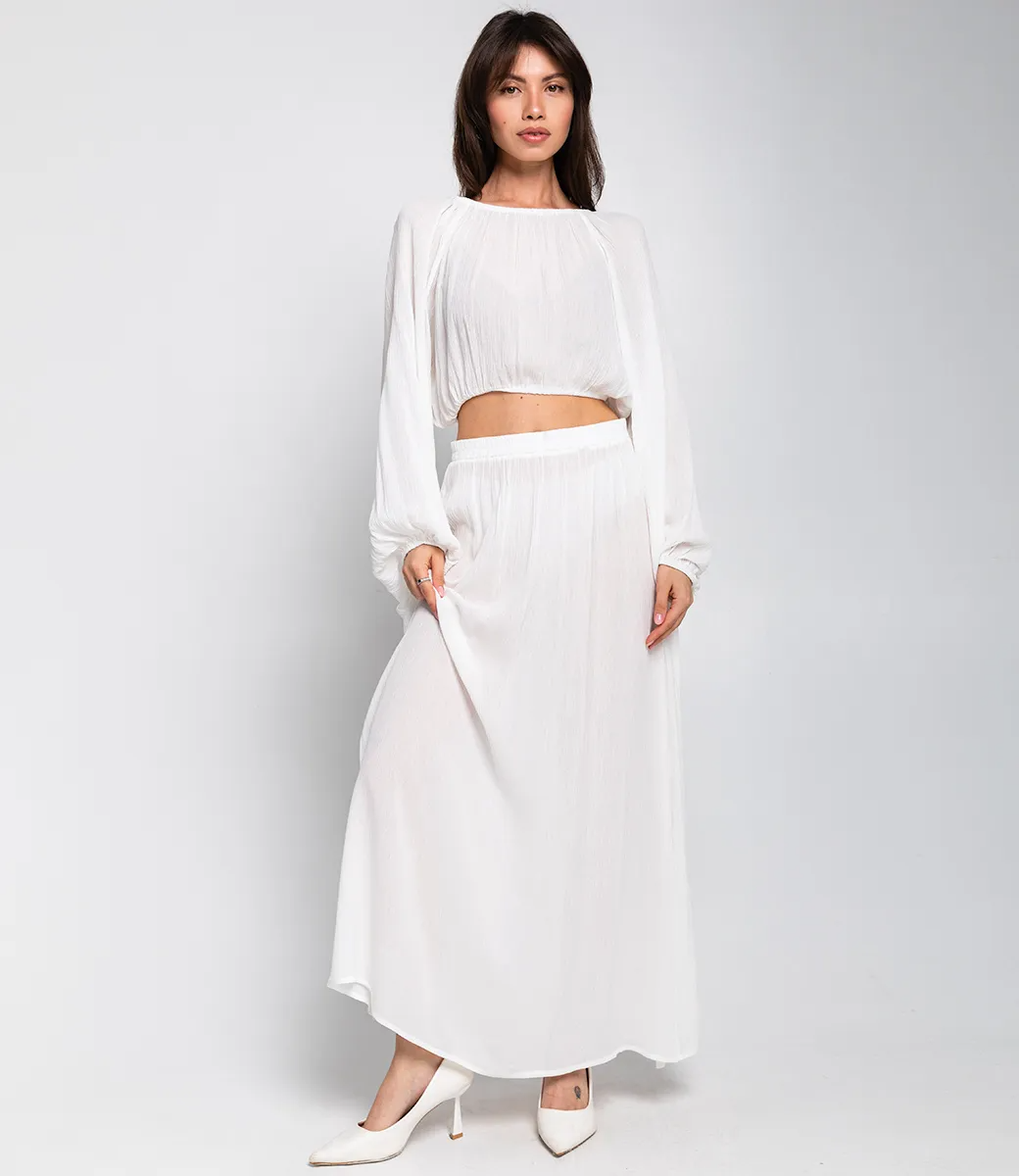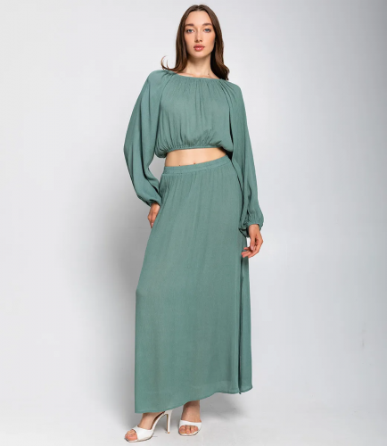 Костюм – это эффектная часть гардероба, подчеркивающая женственность и уникальность каждой представительницы прекрасного пола. Костюм состоит из двух элементов: укороченного топа и длинной юбки макси. Топ свободного кроя с длинными рукавами, которые слегка расширяются к манжетам. Топ длиной чуть выше талии, за счёт чего создаёт акцент на талии. Юбка макси длины, свободного кроя, с эластичной талией и мягкими складками, которые придают плавность и лёгкость силуэту. Для пошива этого костюма использованы ткань с составом 100% вискоза что гарантирует отличное качество и долговечность. Костюм легко выдерживает множество стирок, сохраняя свою первоначальную привлекательность и комфорт. Обратите внимание на цвет и фактуру ткани – они полностью соответствуют фото на сайте и прекрасно дополнят любой летний образ. Для уверенности в размере мы представили на странице таблицу, чтобы вы могли самостоятельно обмерить себя и убедиться в идеальной посадке костюма. Предложенная нами цена является приемлемой, что делает этот комплект отличным выбором для оптовых покупателей. Не упустите возможность предложить вашим клиенткам этот стильный костюм, который станет их любимым выбором для летних дней! Позвольте вашим покупательницам наслаждаться комфортом и элегантностью с этим великолепным комплектом! Рост модели: 164, параметры: 83-61-89.