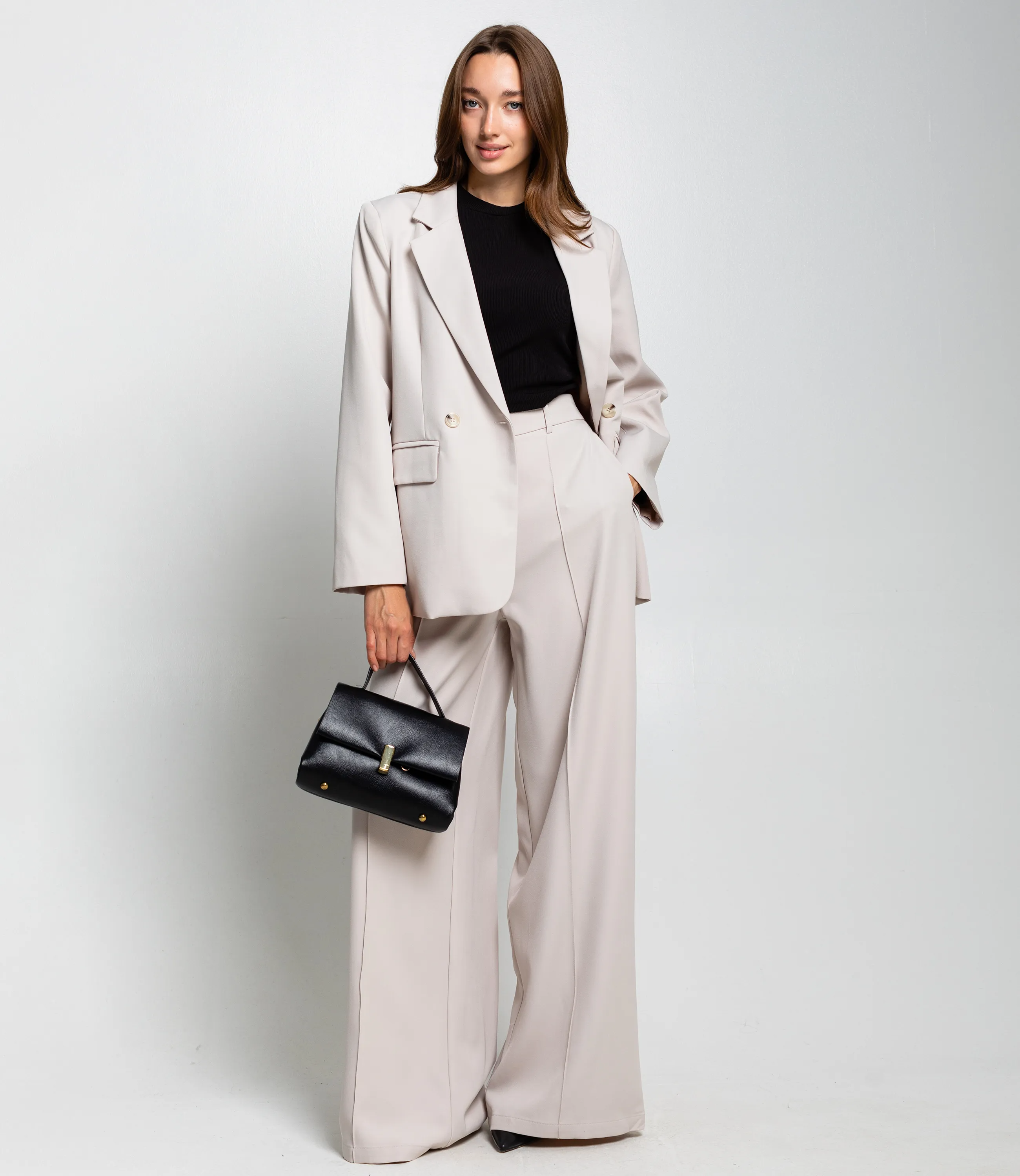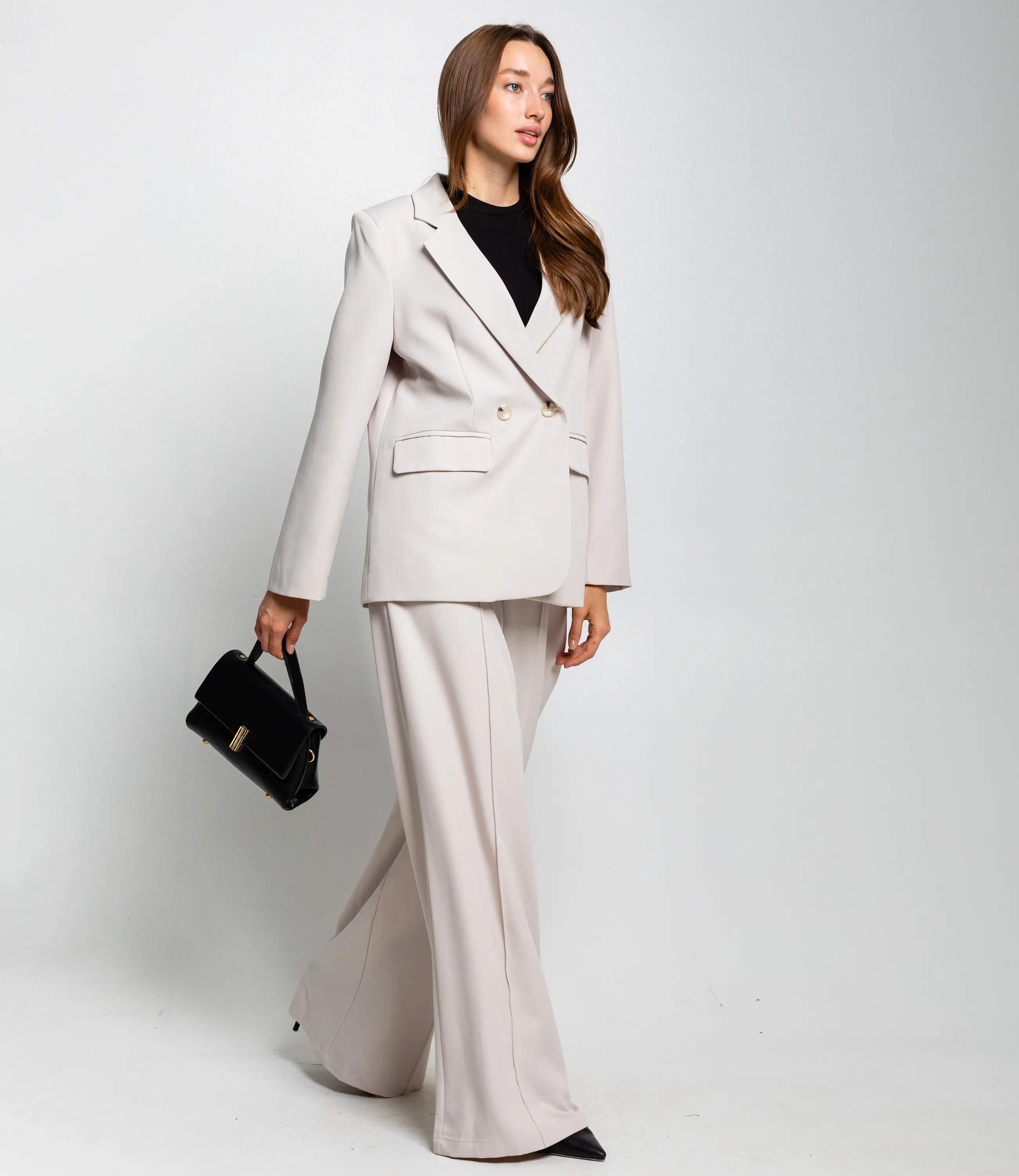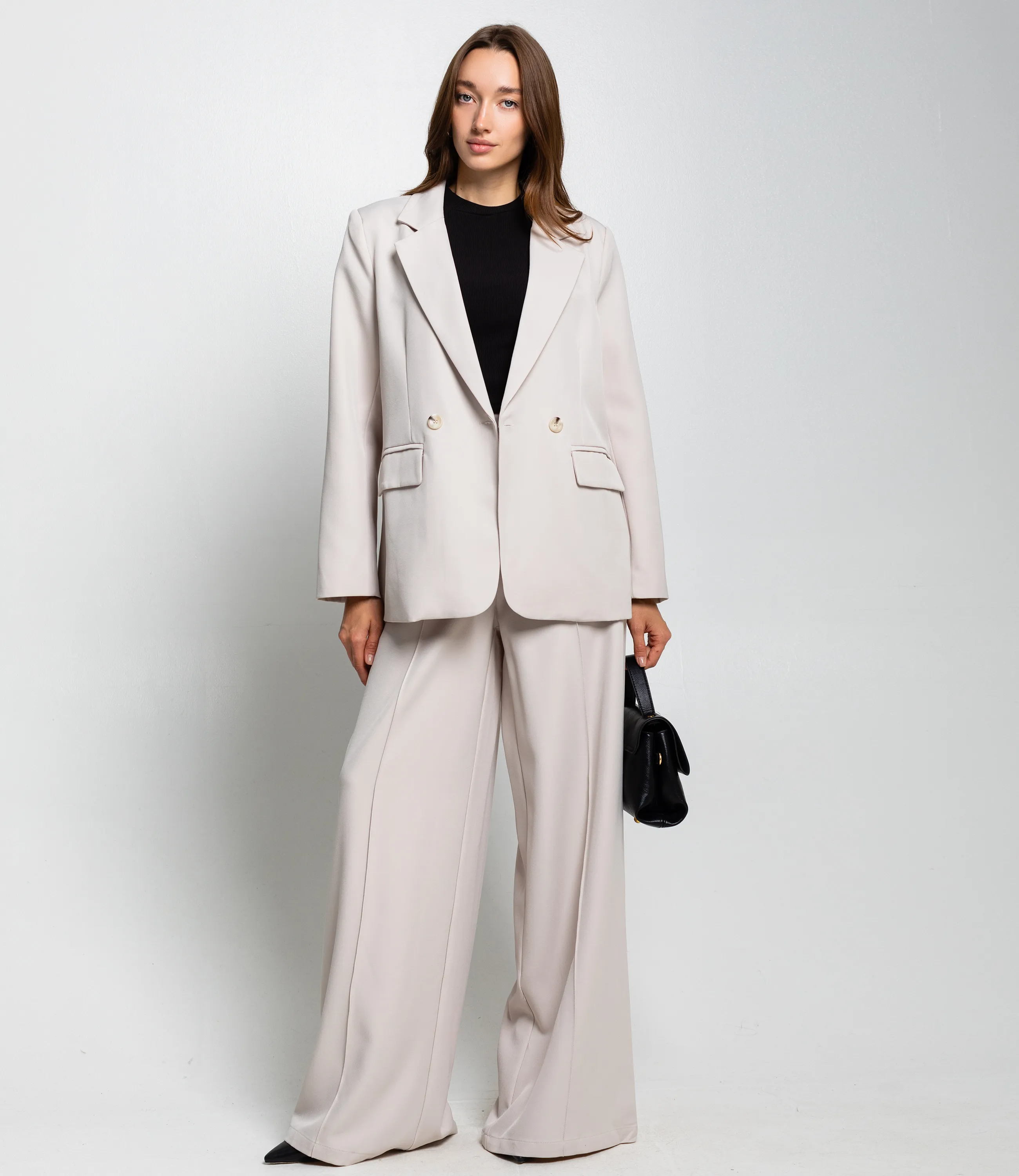 Костюм – это одежда, которая подчеркивает стиль и комфорт каждой женщины. Двубортный жакет прямого кроя с лёгкой структурой плеч и свободным объёмом по торсу. Длина жакета до середины бёдер. Брюки с высокой посадкой и очень широкими штанинами, свободно ниспадающие от бёдер до пола, с выраженной центральной стрелкой. Костюм оформлен в минималистичном, строгом стиле, подходит для деловых и элегантных повседневных образов. Хорошо сочетается с тонкими трикотажными или шелковыми топами, обувью на каблуке или лаконичными лоферами, а также с небольшими структурированными сумками. Для изготовления использованы ткани 100% полиэстера, который характеризуются отличным качеством и дышащими свойствами. Даже после множества стирок изделие не утратит первоначальной красоты. Вы будете носить его с радостью. Обратите внимание на цвет. Он полностью соответствуют фотографии на сайте. Чтобы вы были уверены в размере, мы представили на странице таблицу. Воспользовавшись ею, вы сможете сами обмерить себя и удостовериться. Установленная нами цена является приемлемой. Не откажите себе в удовольствии быть стильной и комфортной!