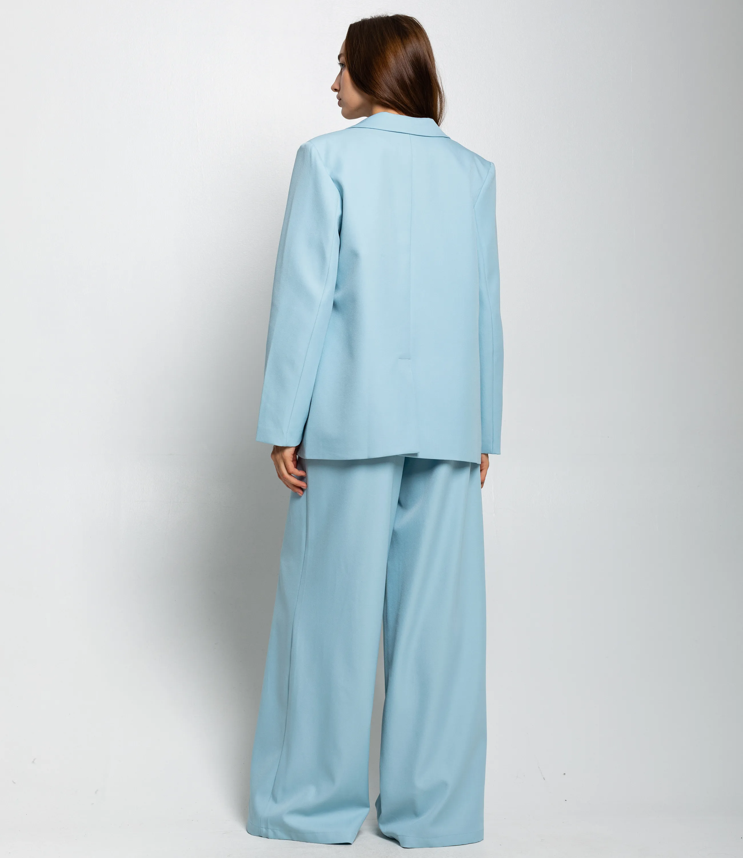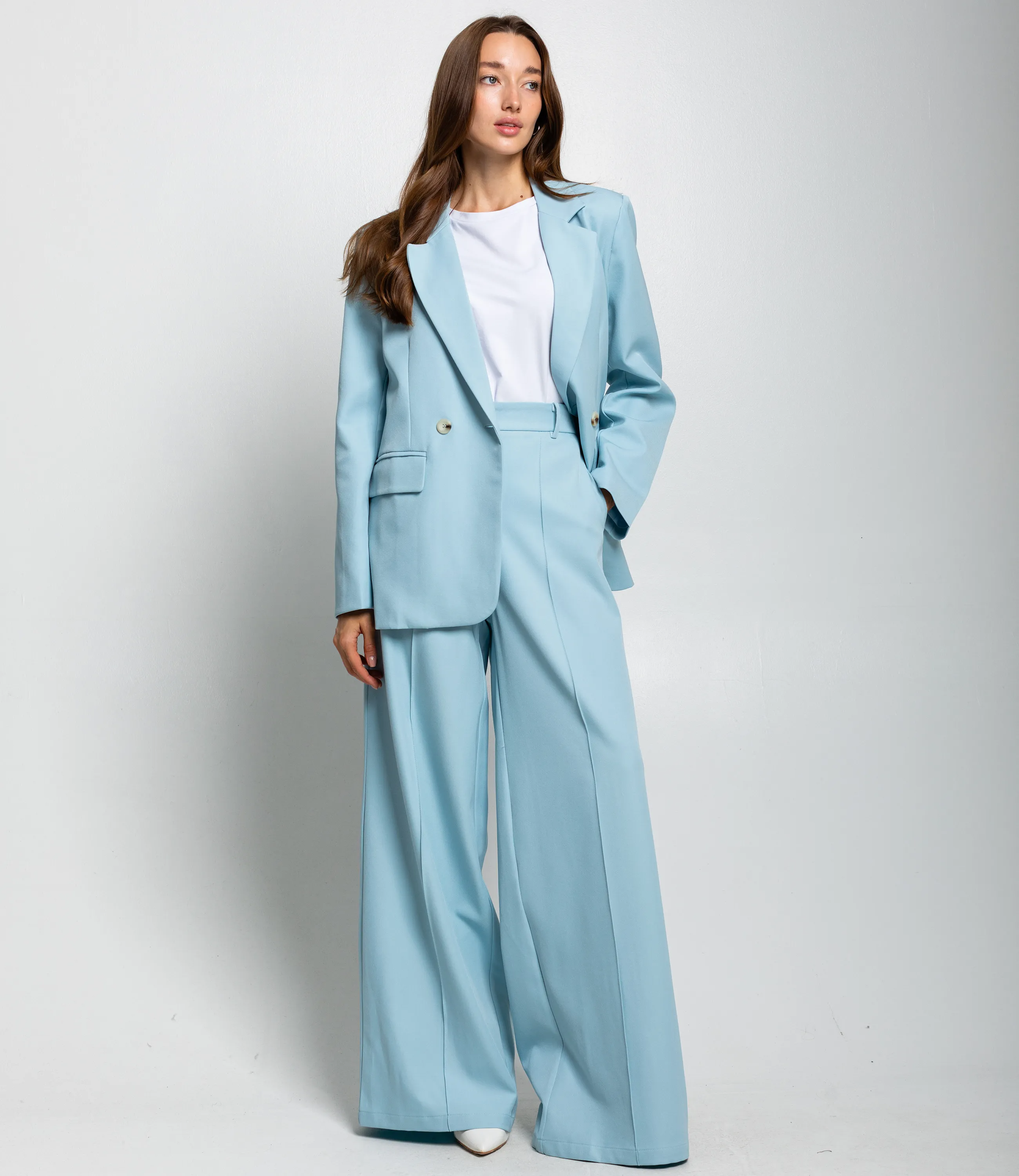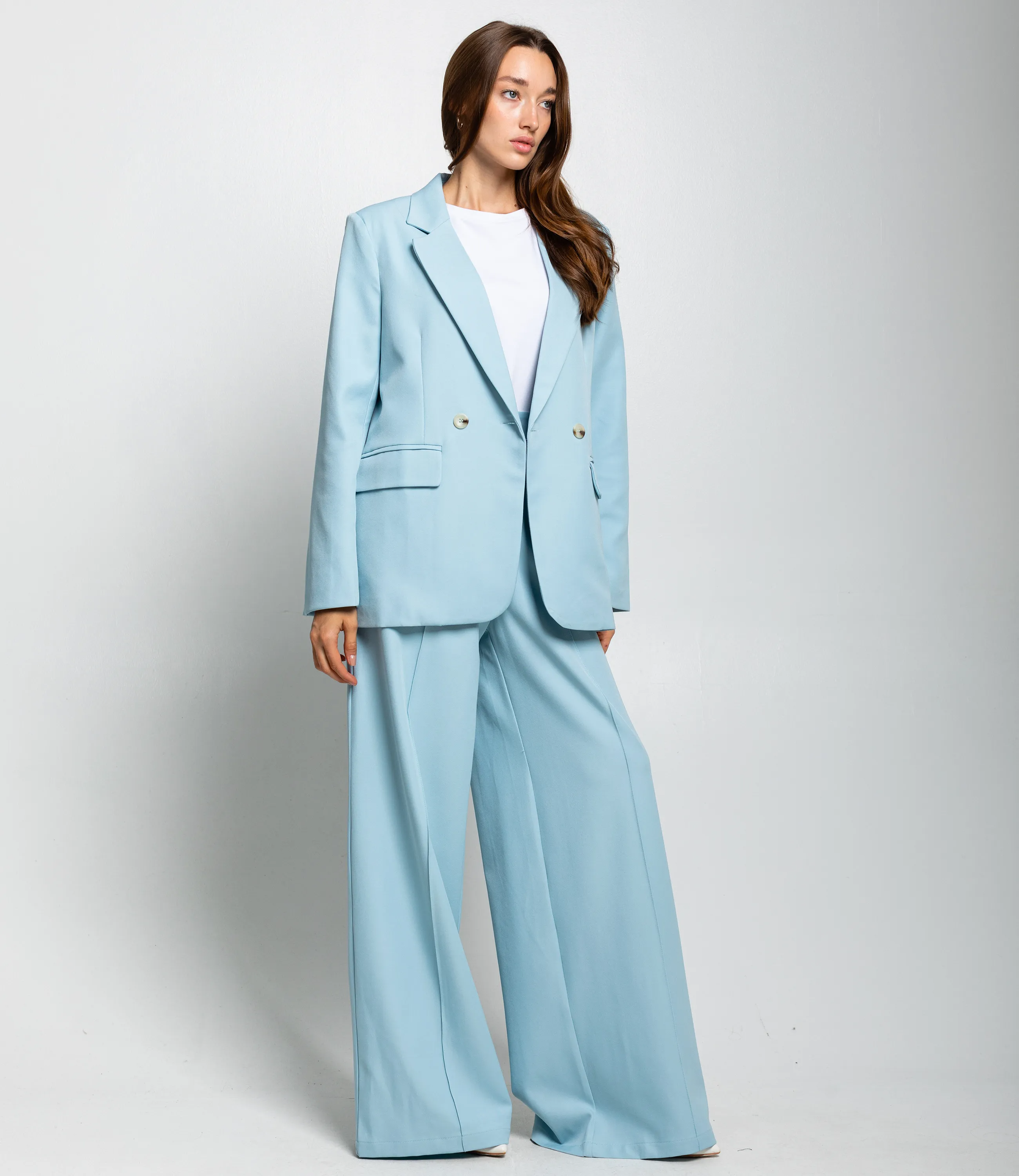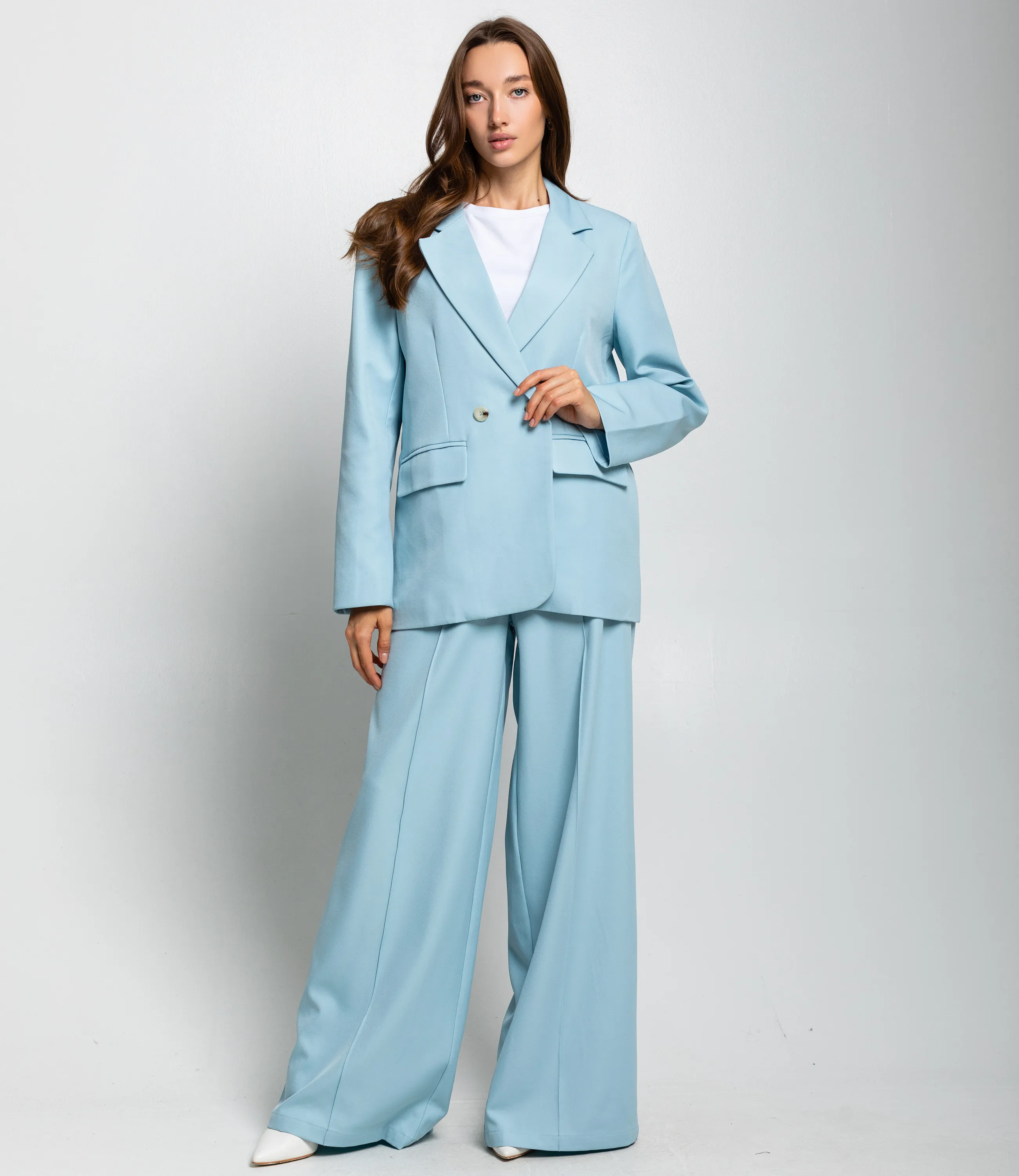 Костюм – это одежда, которая подчеркивает стиль и комфорт каждой женщины. Двубортный жакет прямого кроя с лёгкой структурой плеч и свободным объёмом по торсу. Длина жакета до середины бёдер. Брюки с высокой посадкой и очень широкими штанинами, свободно ниспадающие от бёдер до пола, с выраженной центральной стрелкой. Костюм оформлен в минималистичном, строгом стиле, подходит для деловых и элегантных повседневных образов. Хорошо сочетается с тонкими трикотажными или шелковыми топами, обувью на каблуке или лаконичными лоферами, а также с небольшими структурированными сумками. Для изготовления использованы ткани 100% полиэстера, который характеризуются отличным качеством и дышащими свойствами. Даже после множества стирок изделие не утратит первоначальной красоты. Вы будете носить его с радостью. Обратите внимание на цвет. Он полностью соответствуют фотографии на сайте. Чтобы вы были уверены в размере, мы представили на странице таблицу. Воспользовавшись ею, вы сможете сами обмерить себя и удостовериться. Установленная нами цена является приемлемой. Не откажите себе в удовольствии быть стильной и комфортной!