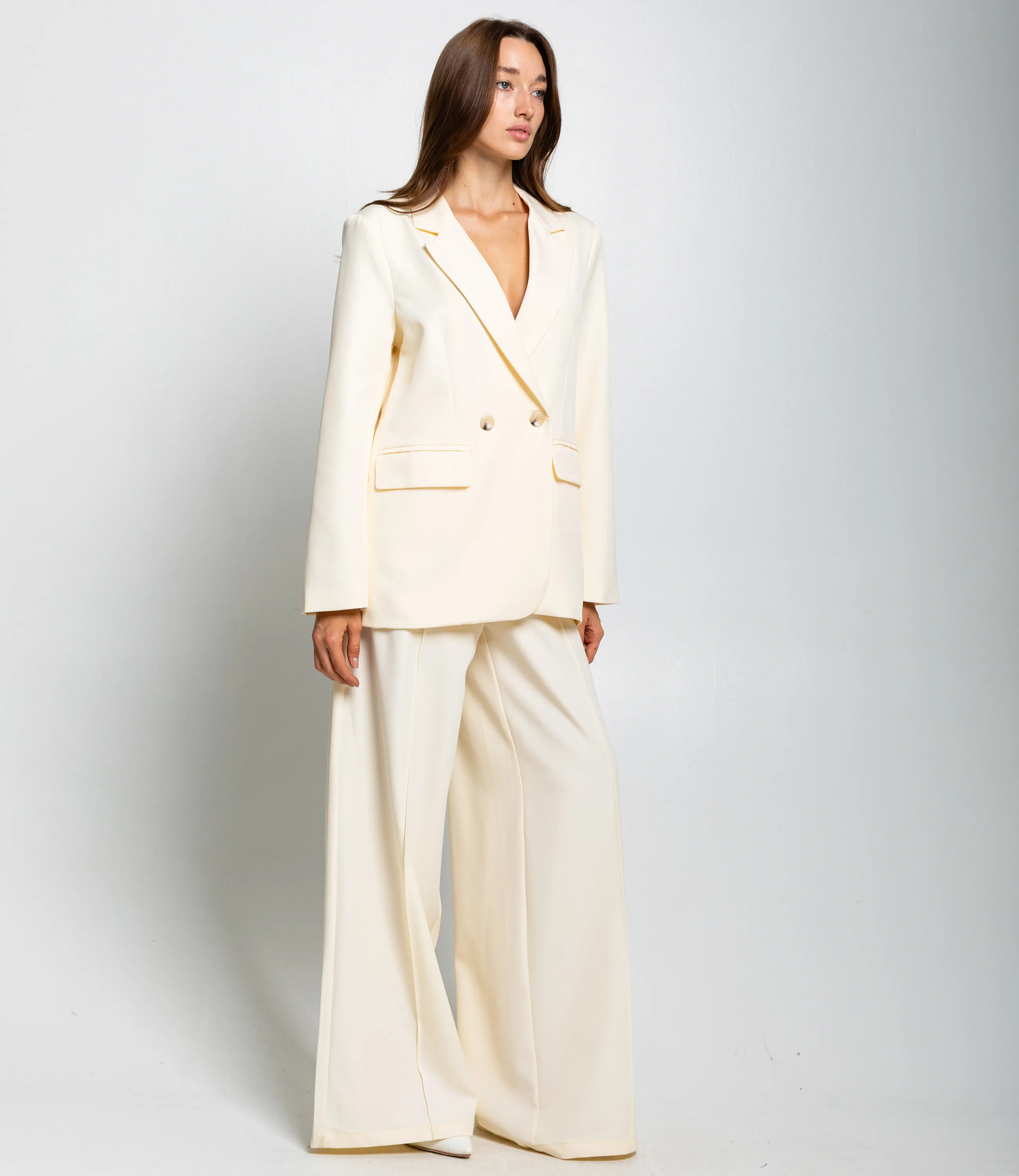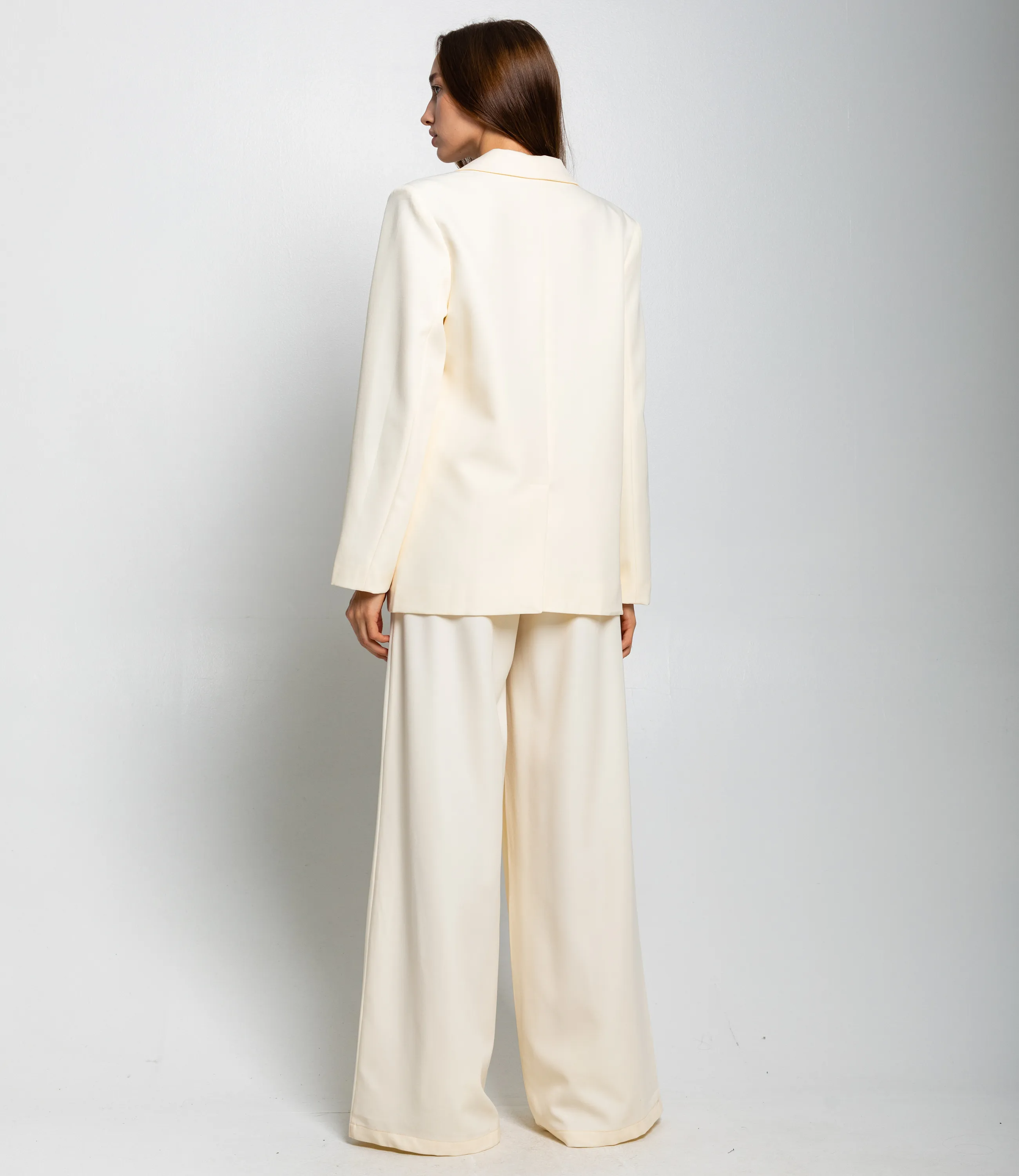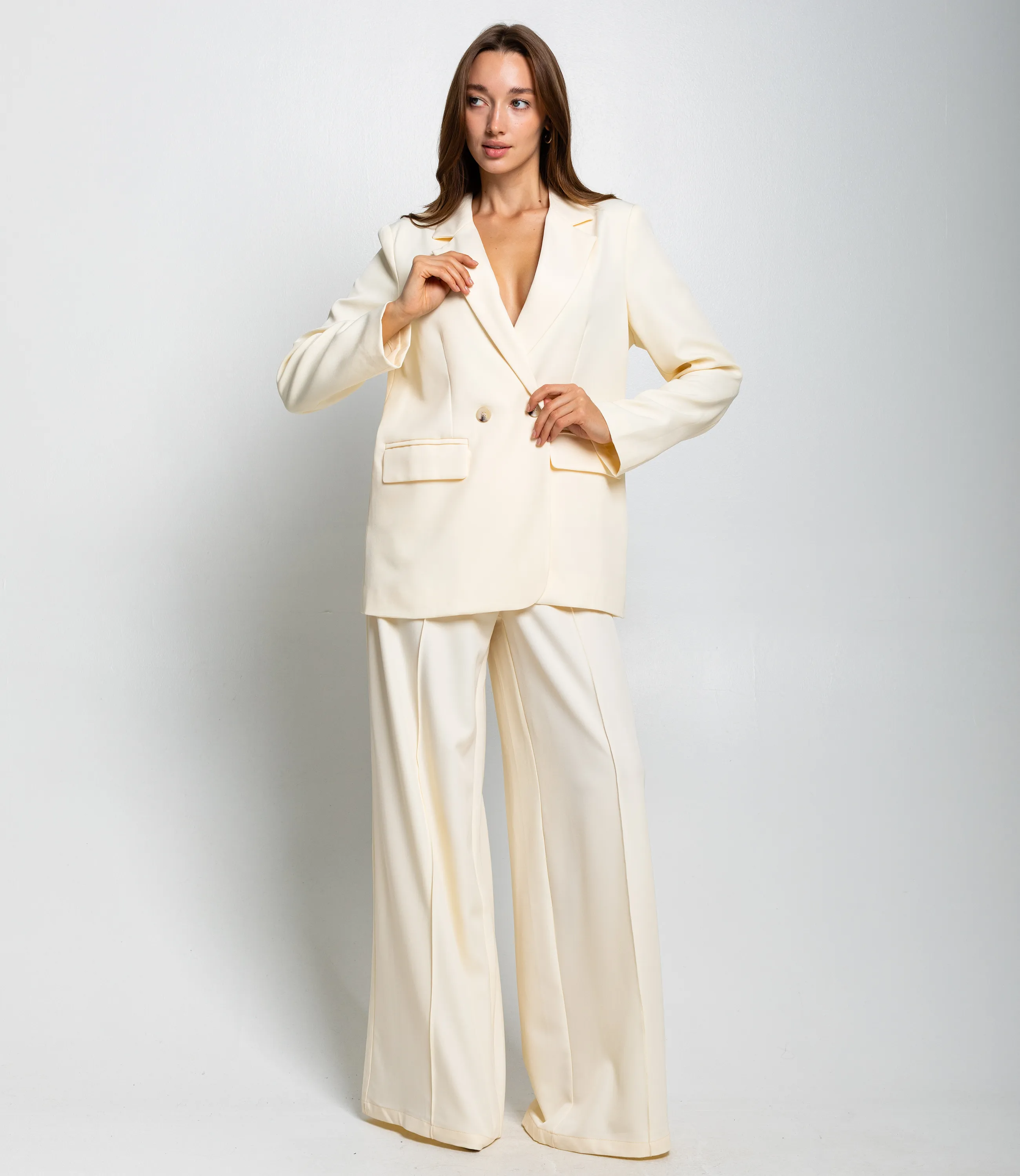 Костюм – это одежда, которая подчеркивает стиль и комфорт каждой женщины. Двубортный жакет прямого кроя с лёгкой структурой плеч и свободным объёмом по торсу. Длина жакета до середины бёдер. Брюки с высокой посадкой и очень широкими штанинами, свободно ниспадающие от бёдер до пола, с выраженной центральной стрелкой. Костюм оформлен в минималистичном, строгом стиле, подходит для деловых и элегантных повседневных образов. Хорошо сочетается с тонкими трикотажными или шелковыми топами, обувью на каблуке или лаконичными лоферами, а также с небольшими структурированными сумками. Для изготовления использованы ткани 100% полиэстера, который характеризуются отличным качеством и дышащими свойствами. Даже после множества стирок изделие не утратит первоначальной красоты. Вы будете носить его с радостью. Обратите внимание на цвет. Он полностью соответствуют фотографии на сайте. Чтобы вы были уверены в размере, мы представили на странице таблицу. Воспользовавшись ею, вы сможете сами обмерить себя и удостовериться. Установленная нами цена является приемлемой. Не откажите себе в удовольствии быть стильной и комфортной!