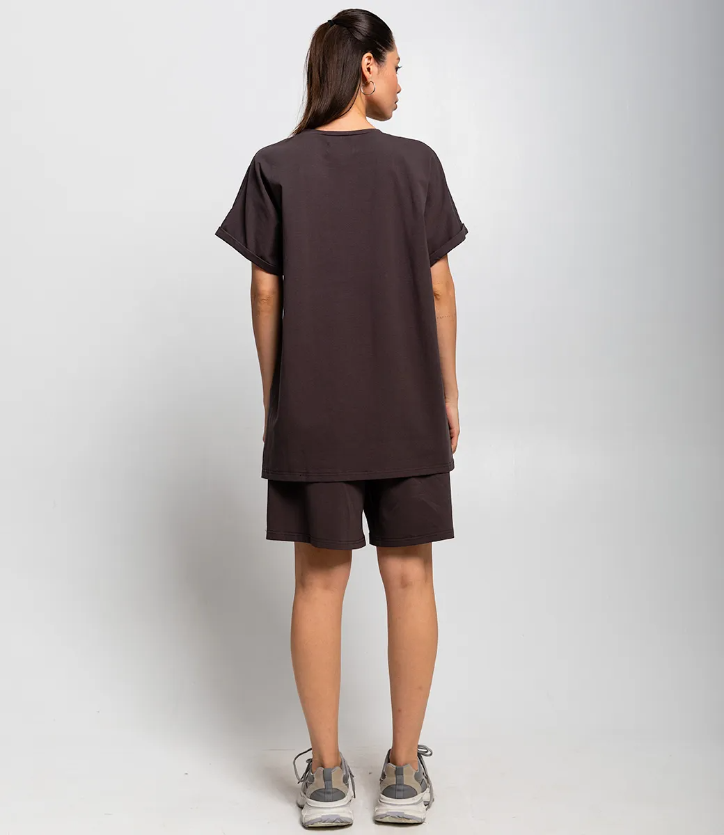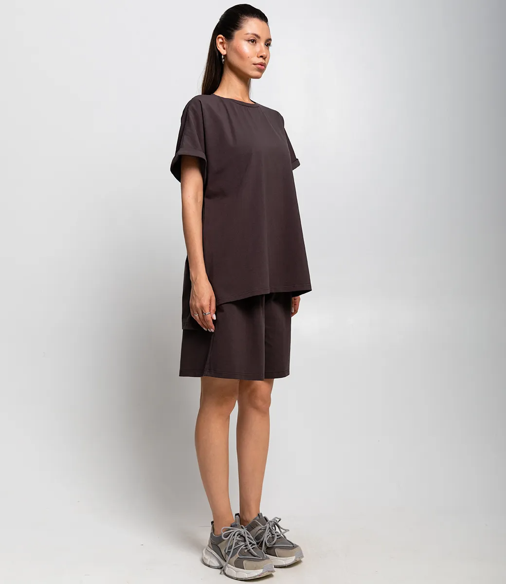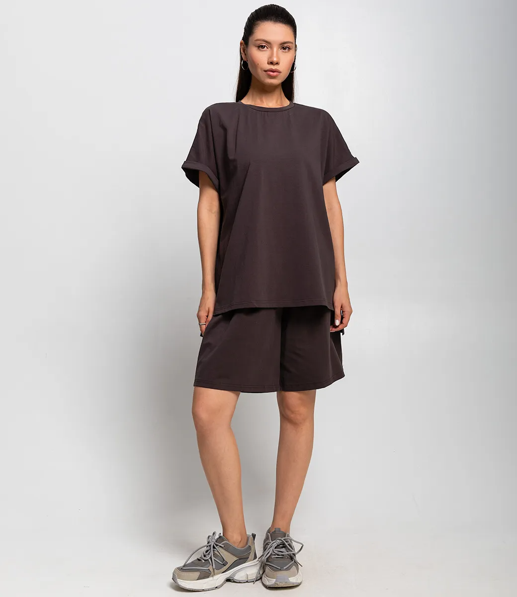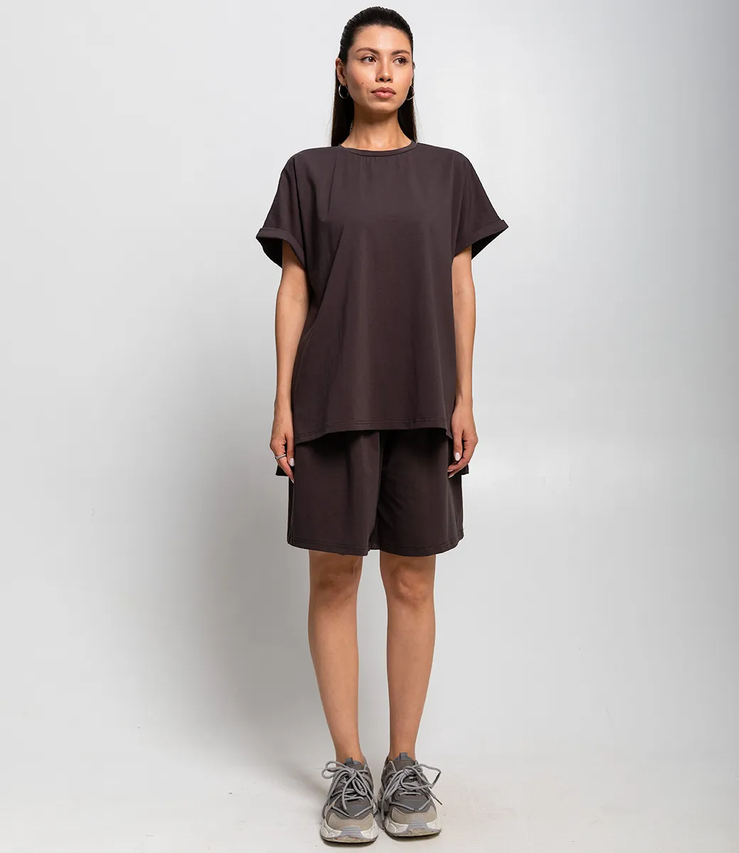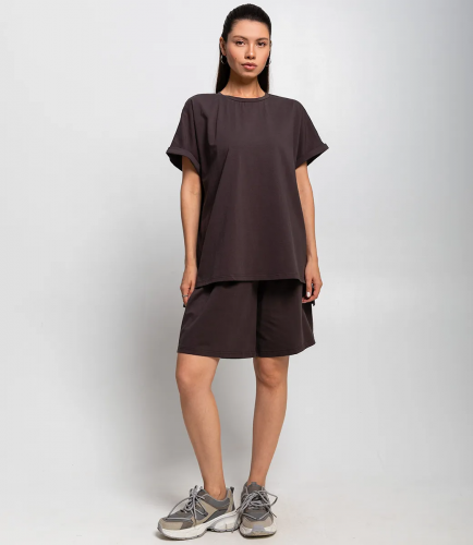 Костюм – это эффектная часть гардероба, подчеркивающая женственность и уникальность каждой представительницы прекрасного пола. Костюм состоит из двух частей — свободной футболки и шорт, выполненных в спокойном темно-коричневом цвете. Футболка имеет классический круглый вырез и рукава средней длины с подворотом, а шорты достигают средней длины на бедрах, обеспечивая комфорт и свободу движений. Основной материал костюма — 95% полиэстер и 5% эластан. Для уверенности в размере мы представили на странице таблицу, чтобы вы могли самостоятельно обмерить себя и убедиться в идеальной посадке костюма. Предложенная нами цена является приемлемой, что делает этот комплект отличным выбором для оптовых покупателей. Не упустите возможность предложить вашим клиенткам этот стильный костюм, который станет их любимым выбором для летних дней! Позвольте вашим покупательницам наслаждаться комфортом и элегантностью с этим великолепным комплектом! Рост модели 164 см., 83-61-89.