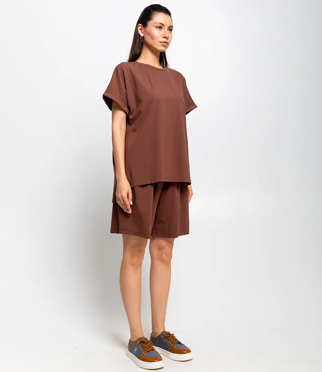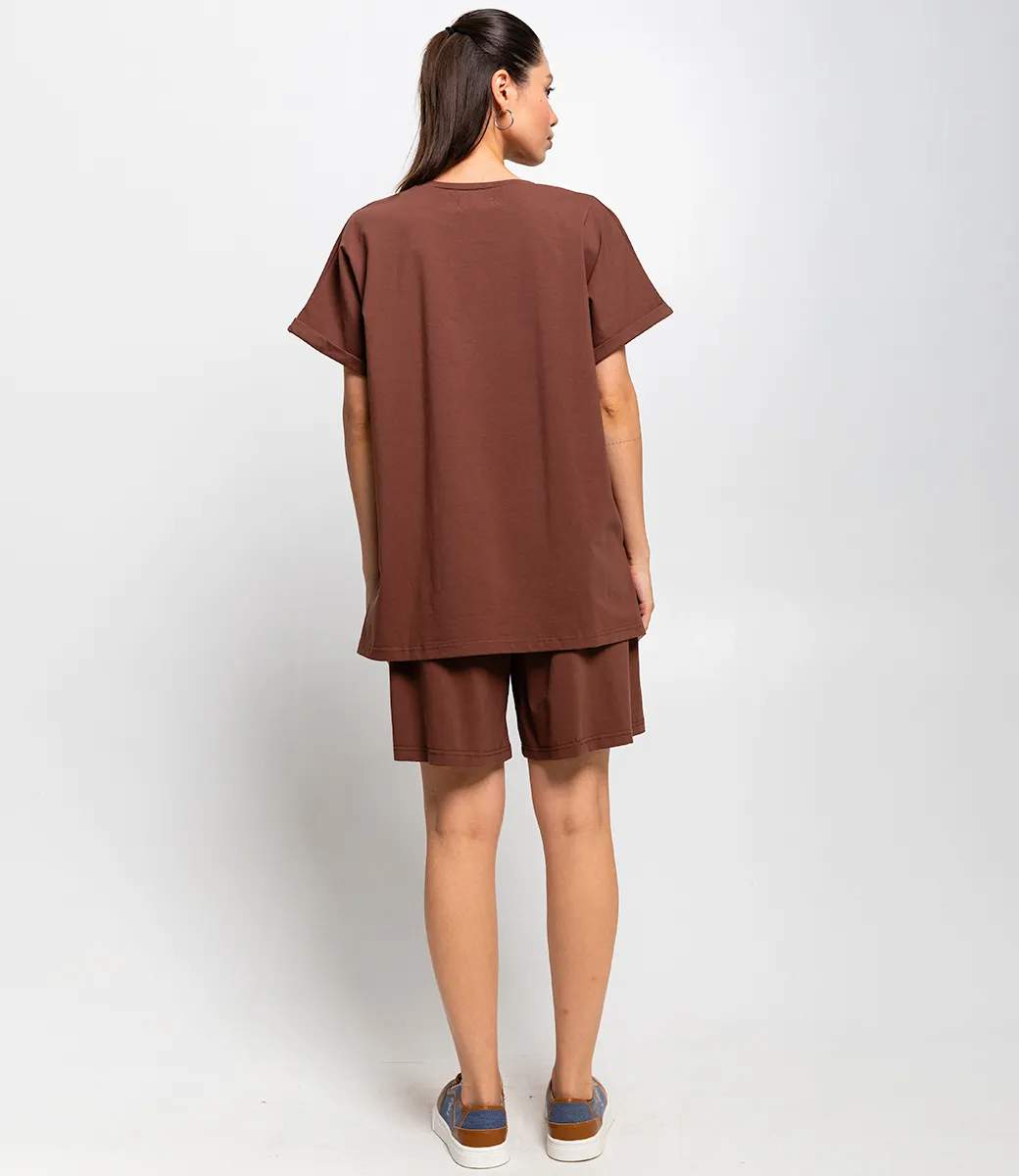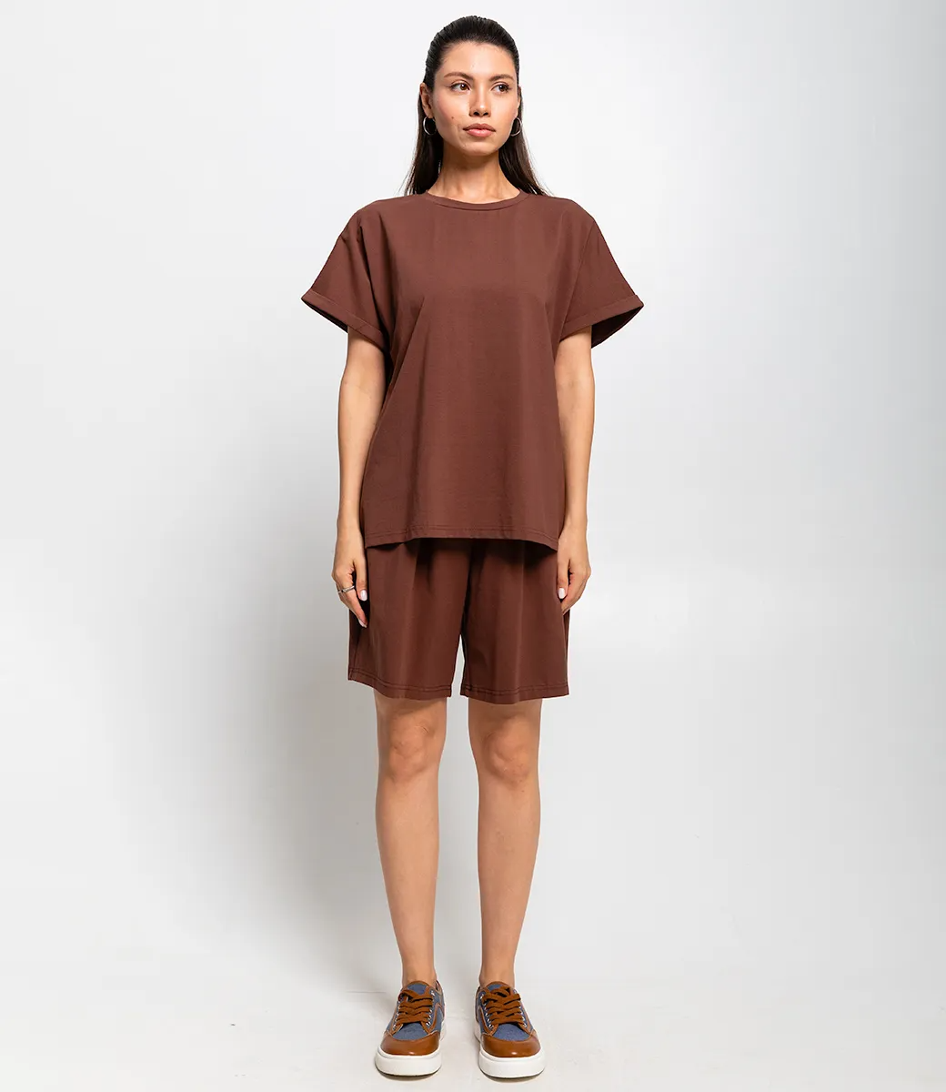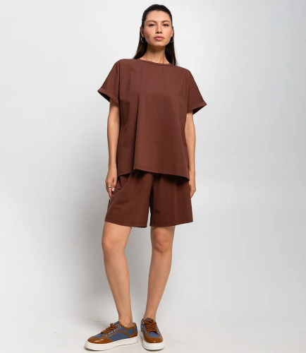 Костюм – это эффектная часть гардероба, подчеркивающая женственность и уникальность каждой представительницы прекрасного пола. Костюм состоит из двух частей — свободной футболки и шорт, выполненных в спокойном темно-коричневом цвете. Футболка имеет классический круглый вырез и рукава средней длины с подворотом, а шорты достигают средней длины на бедрах, обеспечивая комфорт и свободу движений. Основной материал костюма — 95% полиэстер и 5% эластан. Для уверенности в размере мы представили на странице таблицу, чтобы вы могли самостоятельно обмерить себя и убедиться в идеальной посадке костюма. Предложенная нами цена является приемлемой, что делает этот комплект отличным выбором для оптовых покупателей. Не упустите возможность предложить вашим клиенткам этот стильный костюм, который станет их любимым выбором для летних дней! Позвольте вашим покупательницам наслаждаться комфортом и элегантностью с этим великолепным комплектом! Рост модели 164 см., 83-61-89.