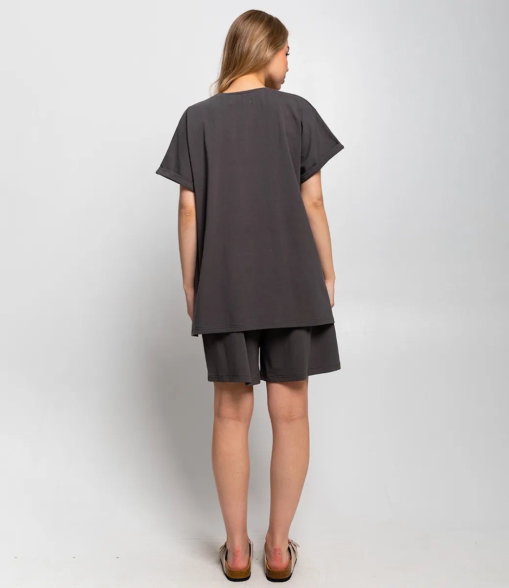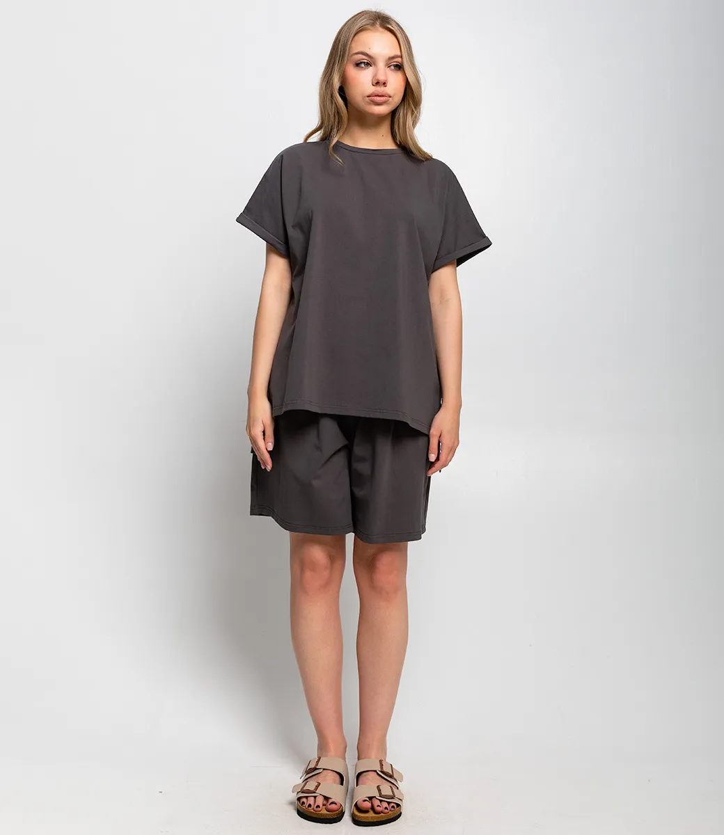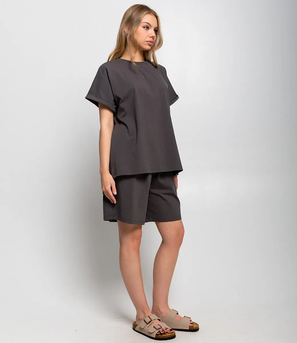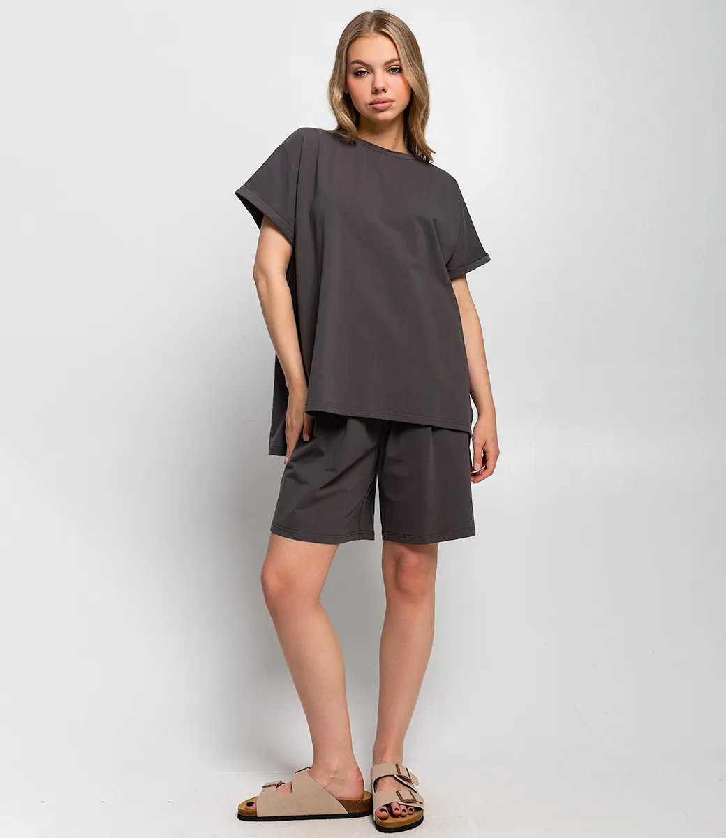 Костюм – это эффектная часть гардероба, подчеркивающая женственность и уникальность каждой представительницы прекрасного пола. Костюм состоит из двух частей — свободной футболки и шорт, выполненных в спокойном темно-коричневом цвете. Футболка имеет классический круглый вырез и рукава средней длины с подворотом, а шорты достигают средней длины на бедрах, обеспечивая комфорт и свободу движений. Основной материал костюма — 95% полиэстер и 5% эластан. Для уверенности в размере мы представили на странице таблицу, чтобы вы могли самостоятельно обмерить себя и убедиться в идеальной посадке костюма. Предложенная нами цена является приемлемой, что делает этот комплект отличным выбором для оптовых покупателей. Не упустите возможность предложить вашим клиенткам этот стильный костюм, который станет их любимым выбором для летних дней! Позвольте вашим покупательницам наслаждаться комфортом и элегантностью с этим великолепным комплектом! Рост модели 168 см., 89-63-90.