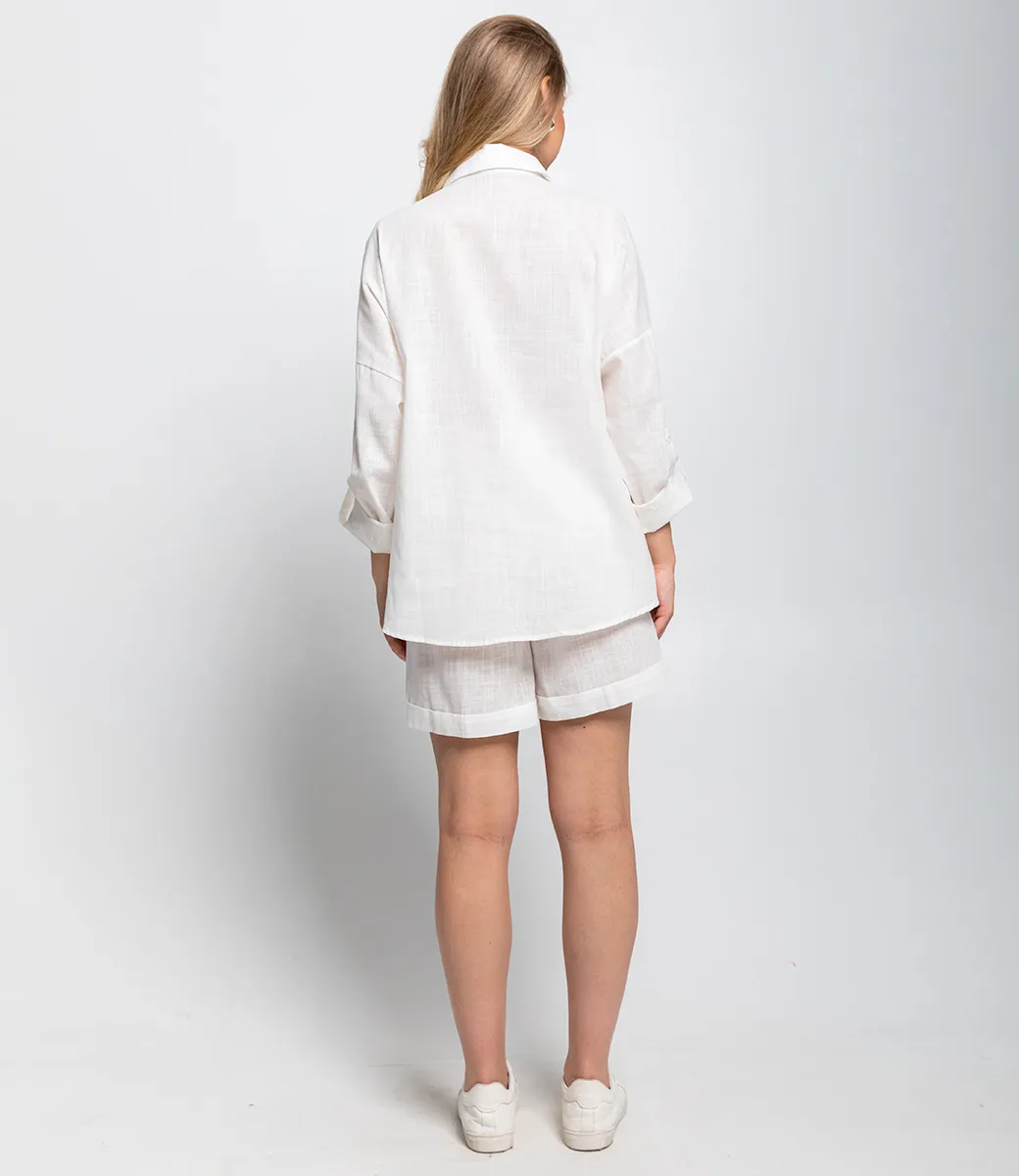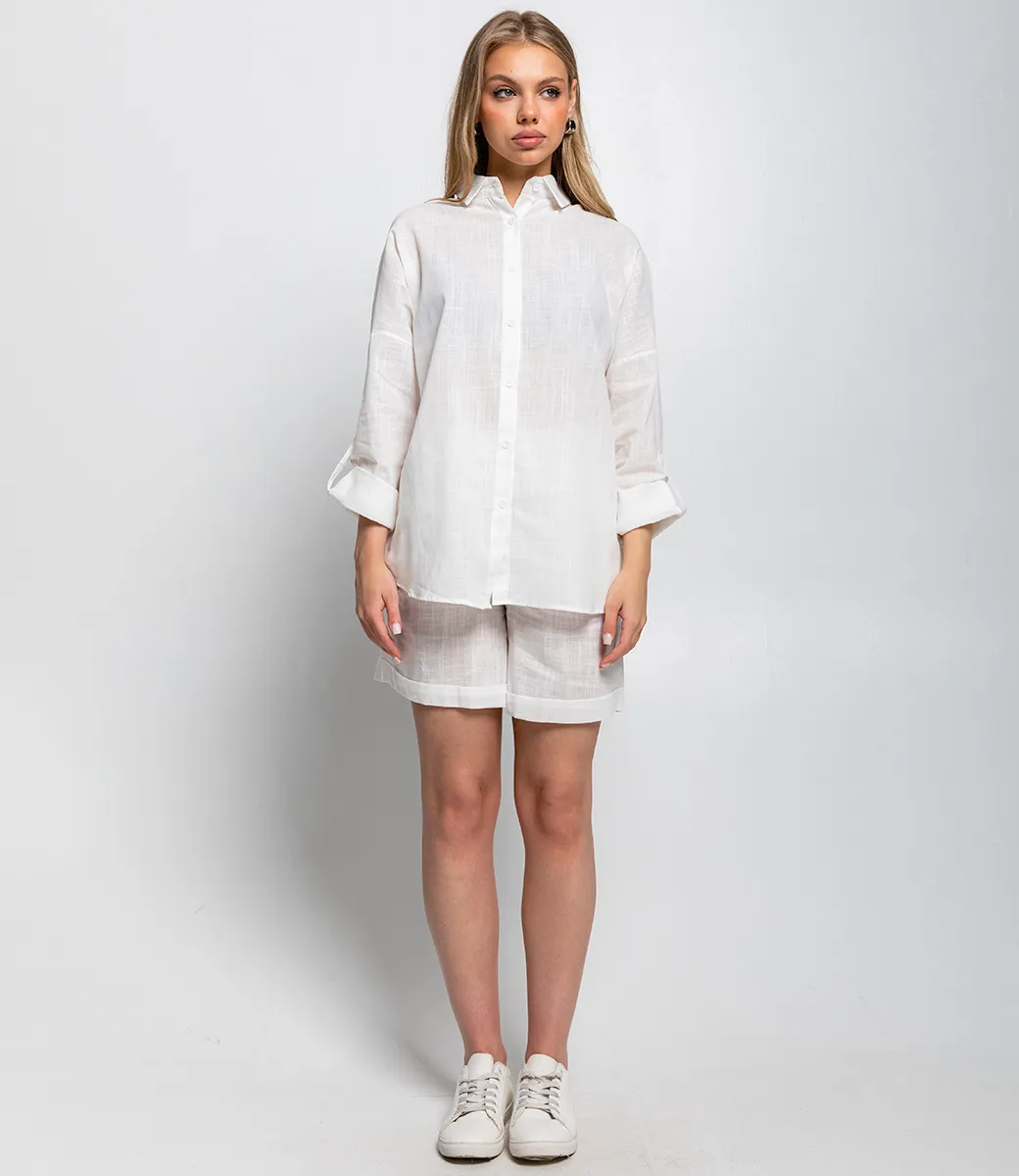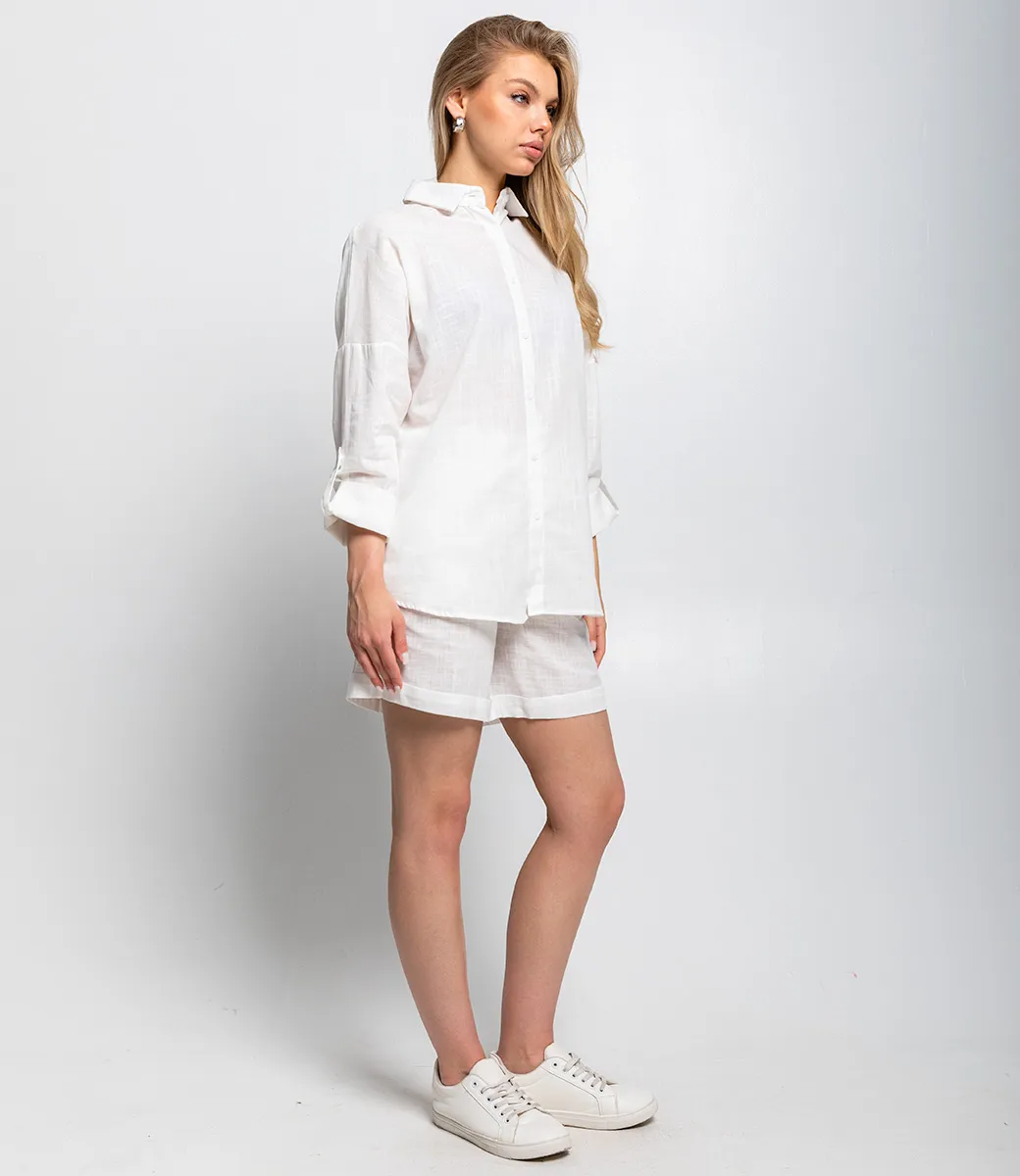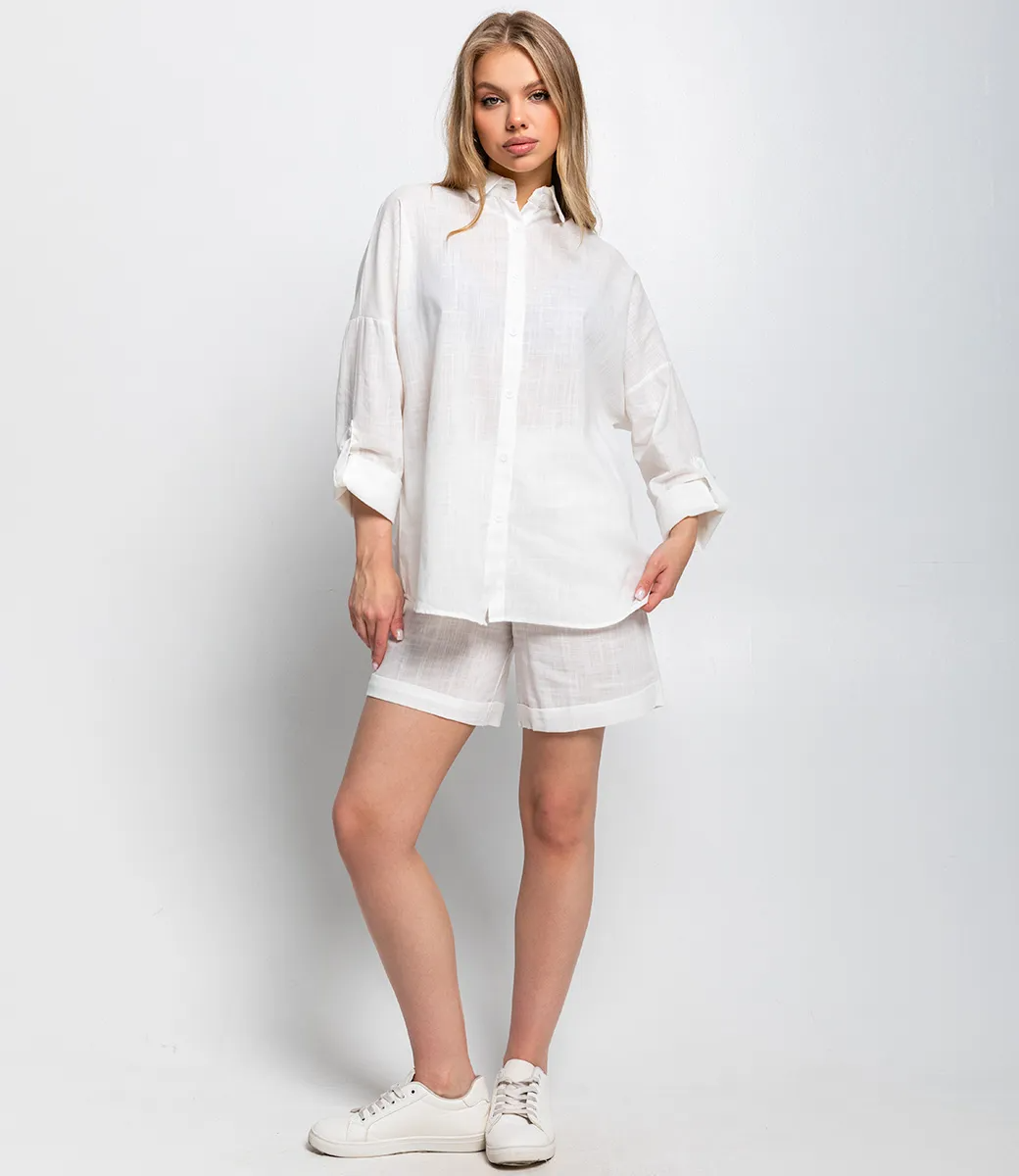 Костюм – это эффектная часть гардероба, подчеркивающая женственность и уникальность каждой представительницы прекрасного пола. Костюм выполнен из ткани, состоящей на 50% из льна и на 50% из хлопка. Такое сочетание материалов обеспечивает высокую комфортность и практичность изделия. Рубашка имеет классический фасон с воротником и застёжкой на пуговицы, а рукава средней длины можно закрепить на закрутку, что добавляет удобства и функциональности. Шорты средней длины с застёжкой на поясе и аккуратным подворотом создают образ сдержанной элегантности и практичности. Обратите внимание на цвет и фактуру ткани – они полностью соответствуют фото на сайте и прекрасно дополнят любой летний образ. Для уверенности в размере мы представили на странице таблицу, чтобы вы могли самостоятельно обмерить себя и убедиться в идеальной посадке костюма. Предложенная нами цена является приемлемой, что делает этот комплект отличным выбором для оптовых покупателей. Не упустите возможность предложить вашим клиенткам этот стильный костюм, который станет их любимым выбором для летних дней! Позвольте вашим покупательницам наслаждаться комфортом и элегантностью с этим великолепным комплектом!Рост модели 168см., 89-53-90.