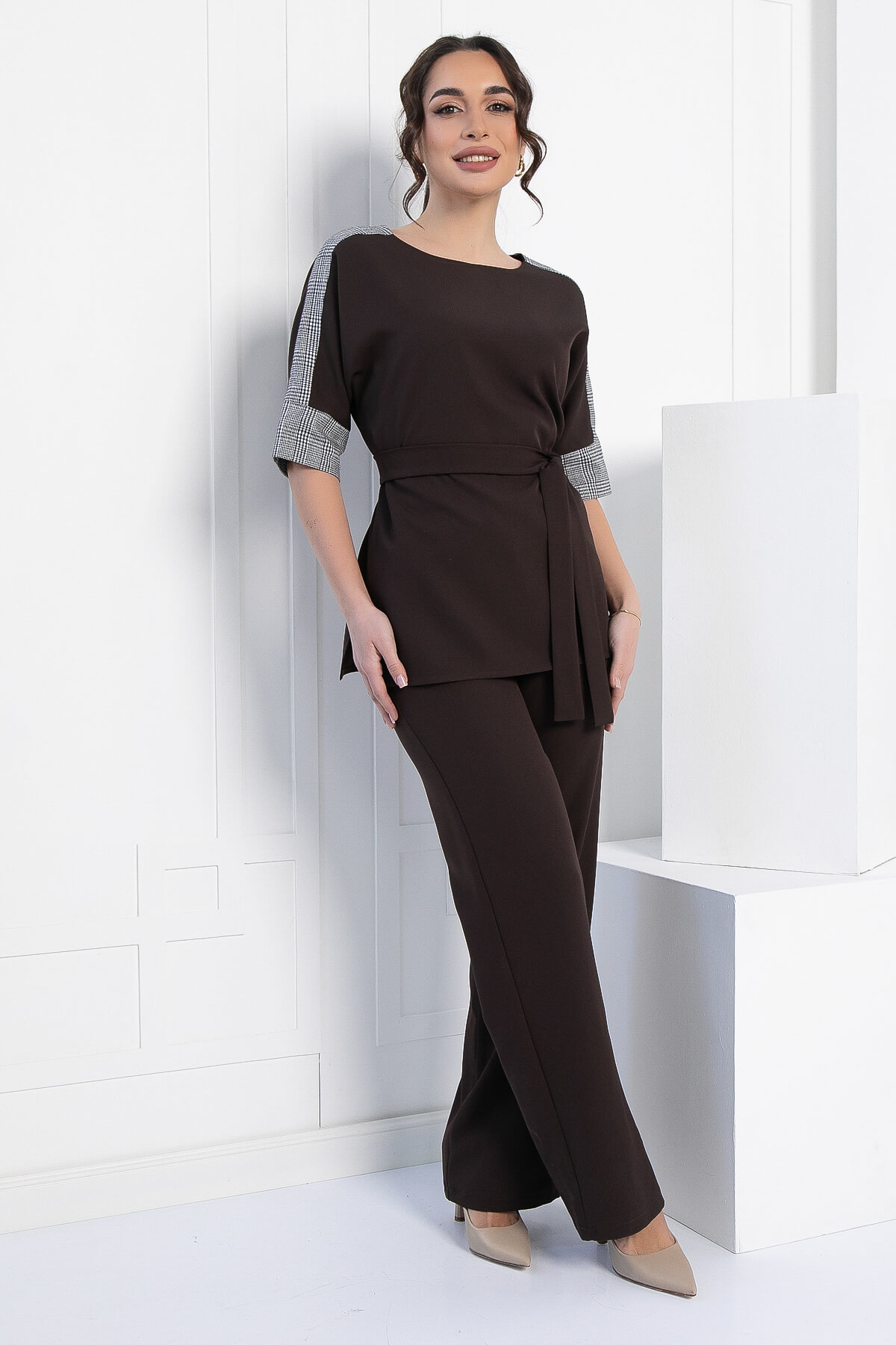 Изящество и грация соединены в брючном костюме, состоящий из классических брюк и блузы прямого кроя. Универсальная модель и расцветка отлично подойдут как к повседневному образу, так и к торжественному. Данный комплект можно носить, подчеркнув талию поясом из основной ткани или же, заправив блузу. В обоих вариантах костюм будет смотреться интересно. Брюки по талии на резинке, в боковых швах есть карманы. Блуза прямого кроя, по бокам есть разрезы. Пояс из основной ткани входит в комплект.