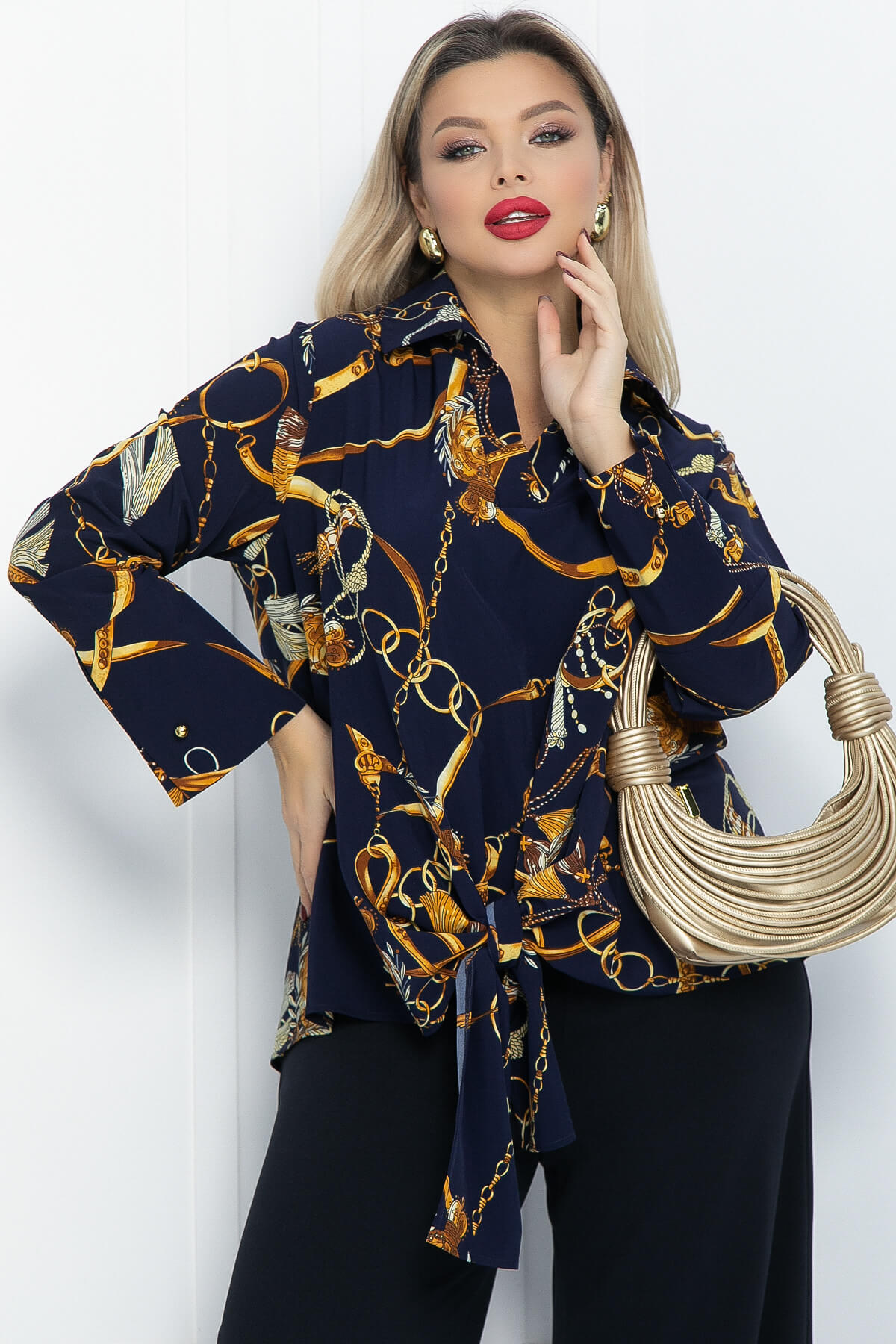 Стильный костюм из приятной к телу ткани с трендовым принтом. Оригинальный блузон свободного кроя имеет рубашечный воротник и элегантную планку поло. Широкий манжет блузона имеет необычную застёжку в виде золотой иглы с горошинами на концах. Украшает блузон нарядная завязка по переду изделия, которую вы можете завязать по своему желанию, корректируя длину блузона. Свободные брюки придают костюму легкость и особый шик. Брюки имеют пояс на комфортной резинке, что позволяет чувствовать себя свободно и не сомневаться при выборе размера. Свободный силуэт костюма подходит абсолютно для любой фигуры. Оригинальный костюм для любого мероприятия позволит вам чувствовать себя элегантно, дорого и в тренде.
