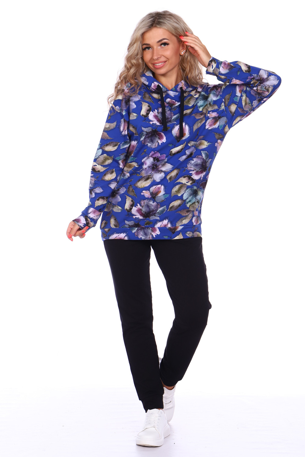 Костюм состоит из толстовки и брюк. Толстовка прямого кроя с капюшоном на завязках, рукава на манжетах. Брюки полуприлегающего силуэта с боковыми карманами, эластичным поясом на резинке и манжетами. Оригинальное сочетание рисунка толстовки и черных брюк.