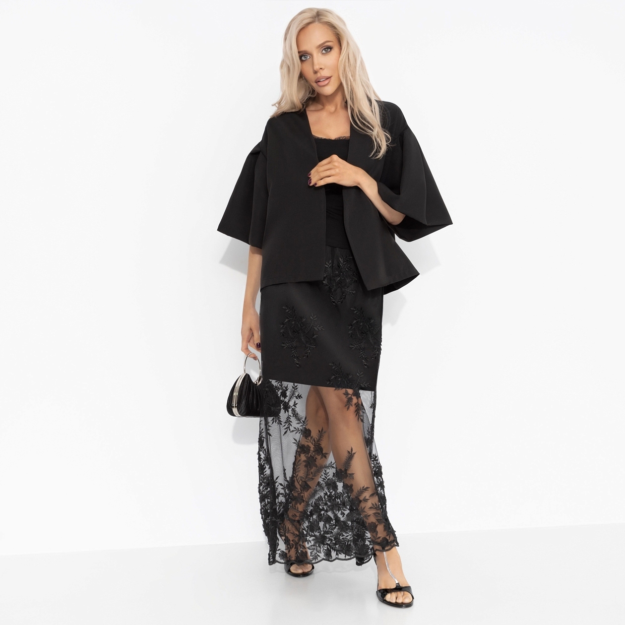 Костюм ЧАРУТТИ – разумная инвестиция в ваш гардероб на все времена. Элегантный жакет нестандартного дизайна, надетый с джинсами или классическими брюками, станет козырем для деловых встреч или светских выходов. Воздушная кружевная юбка добавит таинственности и романтики даже самому простому топу. Сочетаясь вместе, они рождают безупречный праздничный образ, подходящий для самого торжественного события. Комплект состоит из юбки в длине миди и жакета. Жакет свободного кроя на запах. Тонкий пояс в комплекте. Юбка с подкладом. Верхний слой из тонкого кружева. Пояс юбки на резинке.