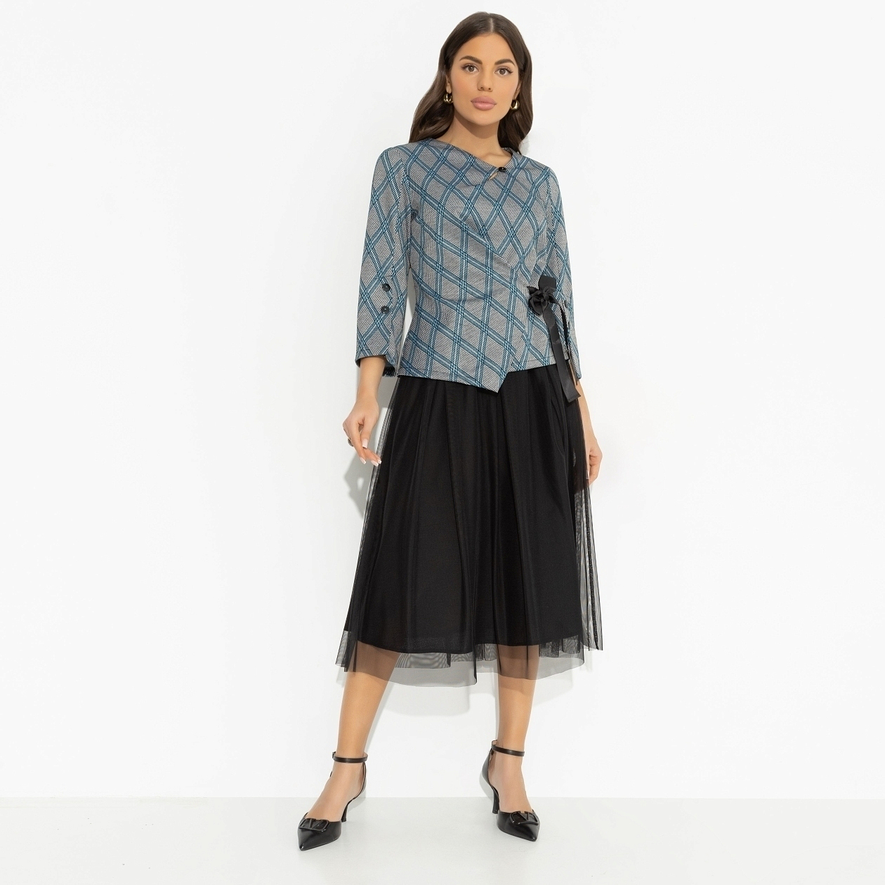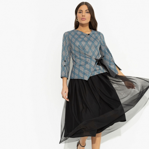 Если вам нужно будет сфотографироваться на доску почета лучших работников, попросите сделать фото в полный рост. Не хочется упускать из вида юбку из трендовой сетки. В костюме CHARUTTI важен каждый элемент. Комплект состоит из приталеннного укороченного жакета и юбки в длине миди. Рукав жакета укорочен, украшен пуговицами. Ассиметричный дизайн на завязках. Пояс юбки оформлен широкой резинкой, есть подклад.