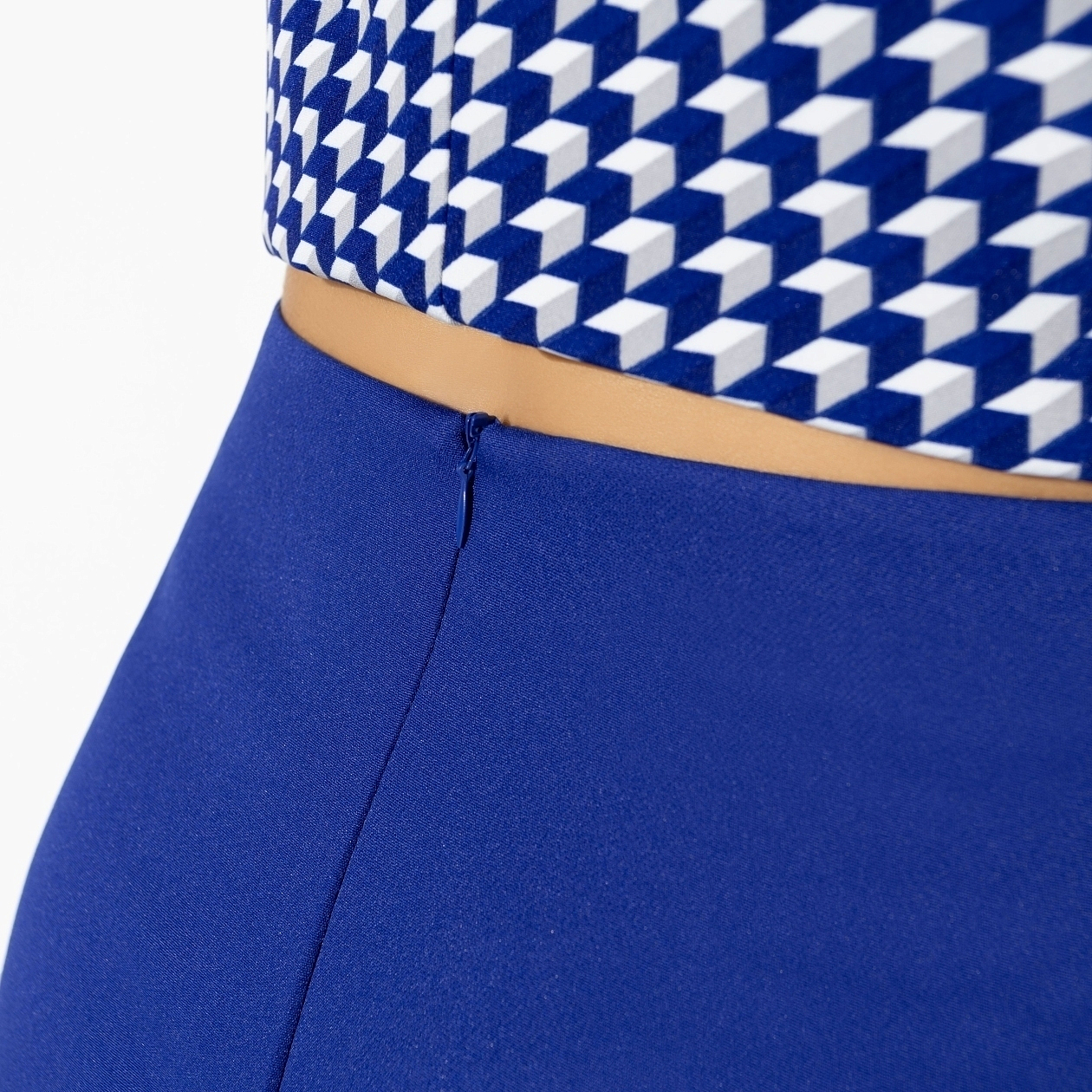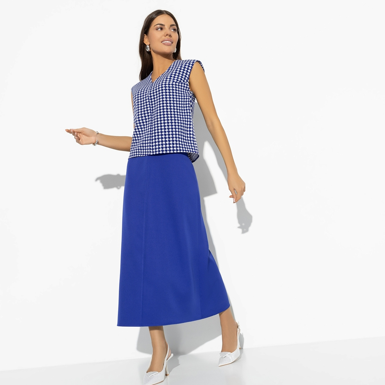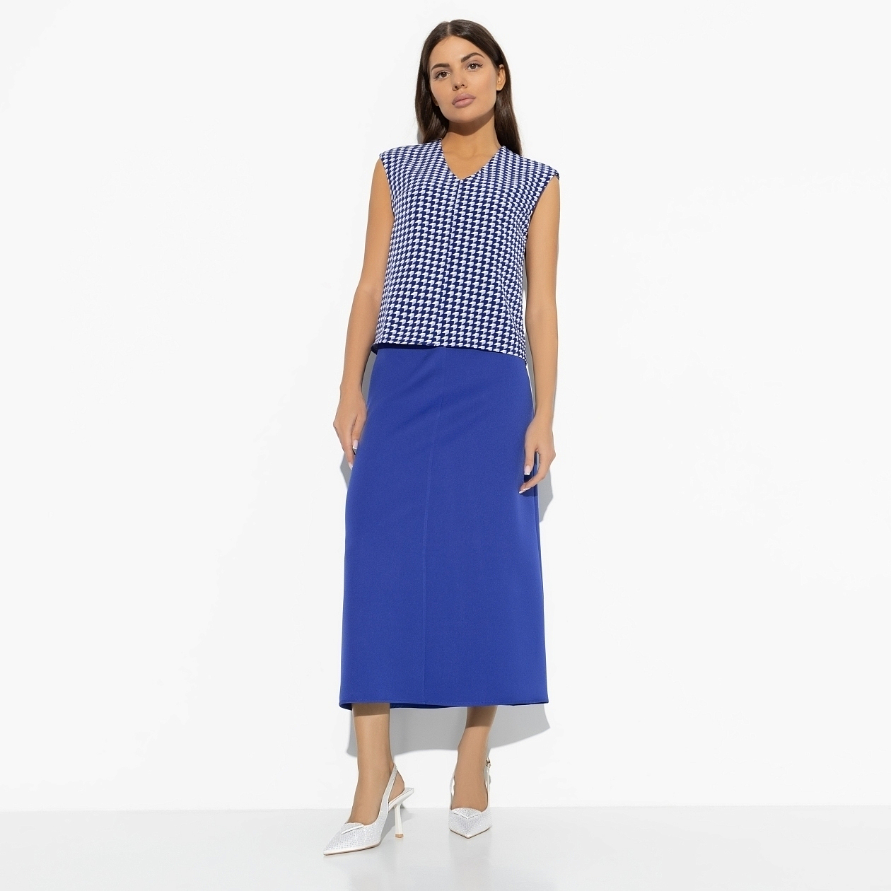 Бывают дни, когда нужно выглядеть на высоте, а настроения подбирать комбинации нет. Именно для таких случаев дизайнеры CHARUTTI создали костюм с юбкой в яркой синей гамме. Все придумано за вас. Ваше дело – купить и надеть. В комплект входит топ без рукавов и юбка-трапеция в длине миди. Топ без застежки. Юбка имеет скрытую молнию по задней части изделия.