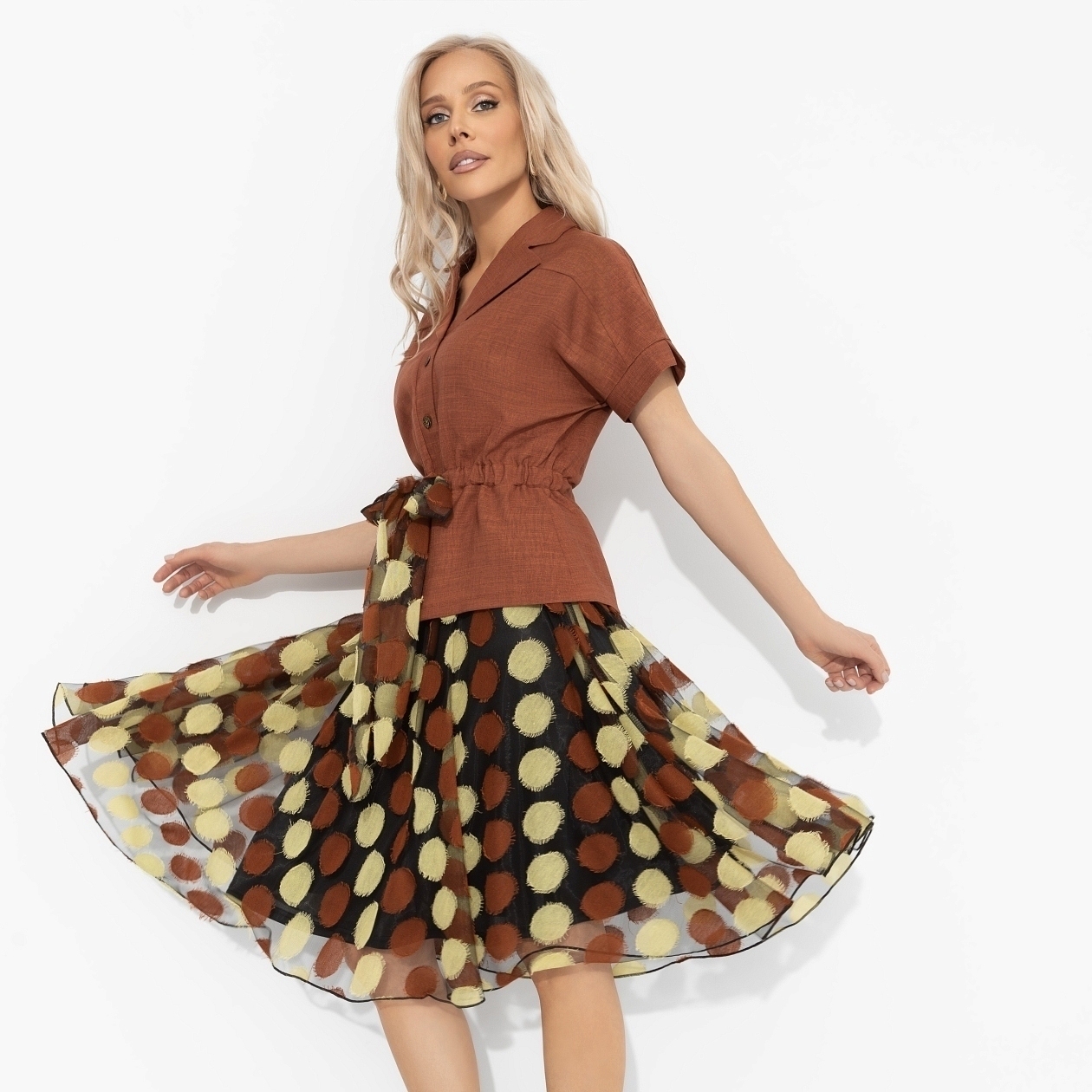 Лёгкое движение – и юбка оживает, словно танцует под музыку ветра. Этот костюм – для тех, кто ценит игру форм и фактур, кто умеет сочетать элегантность с лёгкой ироничностью. «Светские манеры» – не про строгость, а про очарование уверенности и чувство собственного стиля. Костюм с юбкой из сетки в крупный горох. Контраст текстур, струящаяся форма и акцент на поясе создают идеальный баланс между шиком и комфортом.