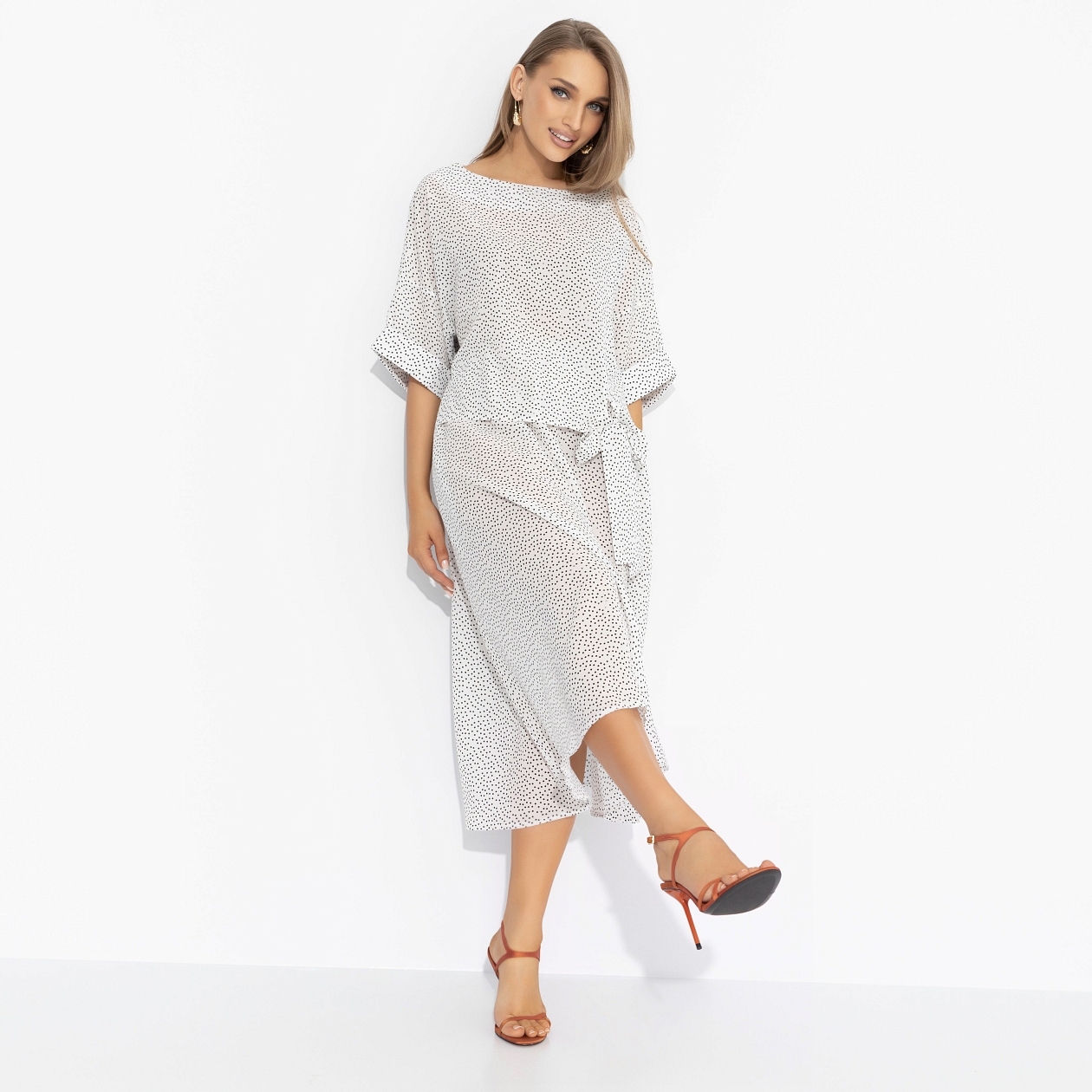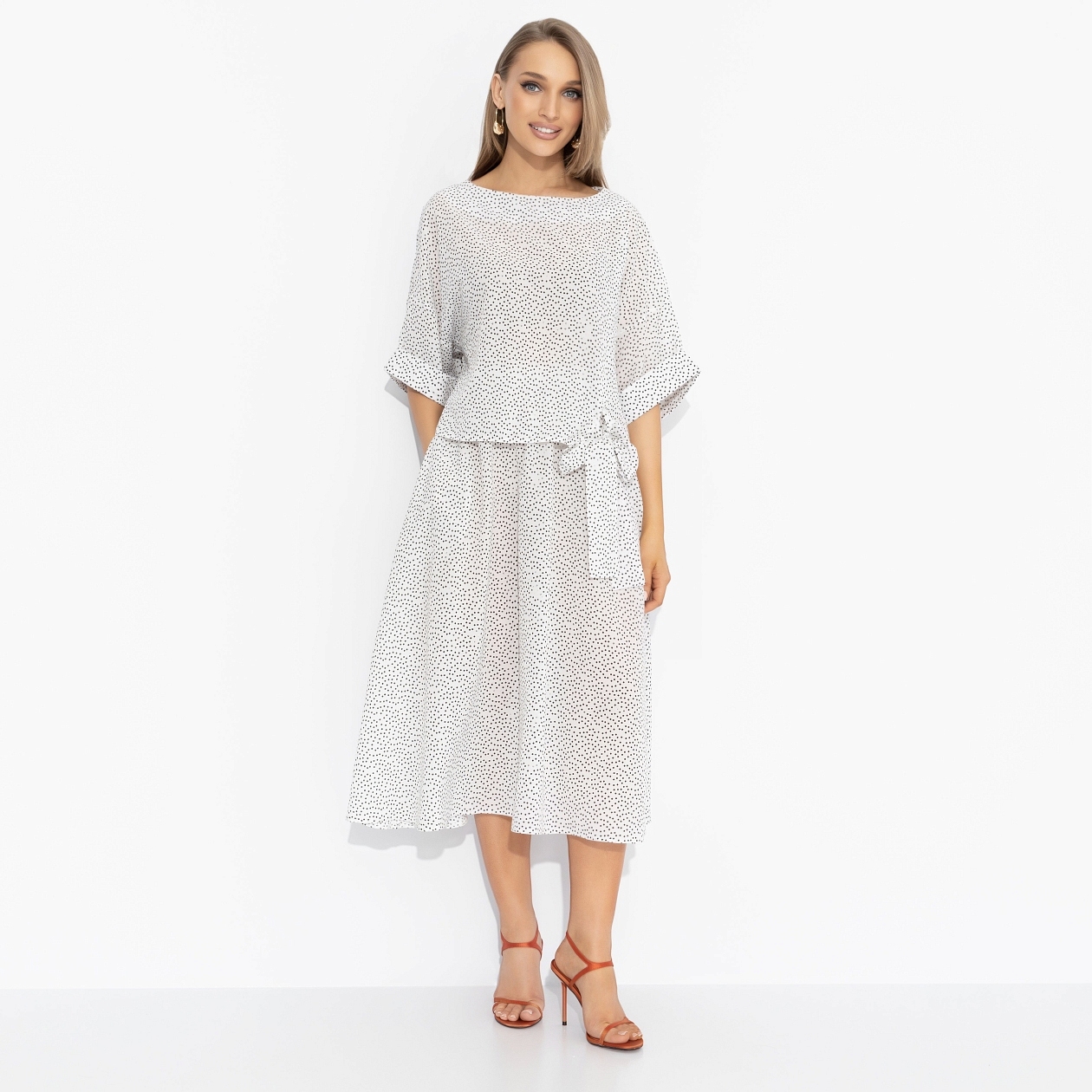 Ворваться в его жизнь было отличной идеей. Теперь тебя ждут регулярные ужины с его семьей в загородном поместье. В костюме с юбкой от ЧАРУТТИ легко понравиться его маме, так ты намекаешь на серьезные намерения. Комплект из блузы свободного кроя и юбки в длине миди. Юбка расклешенная, с карманами с двух сторон изделия. Пояс на широкой скрытой резинке. Блуза дополнена широкими вшитыми завязками.
