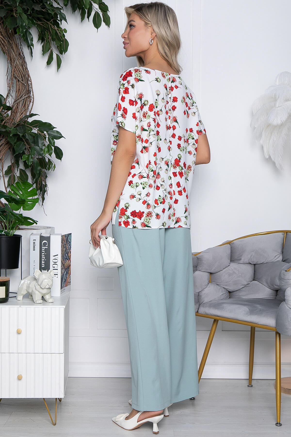 Стильный летний костюм превосходно подходит для прогулки, поездки или отдыха.Такая модель хороша тем, что её можно носить не только в комплекте, но и по отдельности!Брюки имеют пояс на комфортной резинке,карманы расположены сбоку. Блузка со спущенным плечом, и с разрезами по бокам.
