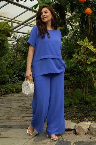 Универсальный брючный костюм на каждый день! Блузка свободного кроя с цельнокроеным укороченным рукавом на манжете. Застроенная по переду складка и разрезы по бокам создают ощущение лёгкости. Брюки прямого кроя с притачным поясом на резинке, с карманами, обеспечивают комфорт и элегантность. В таком костюме можно пойти не только на прогулку, но и на работу или на встречу с друзьями.