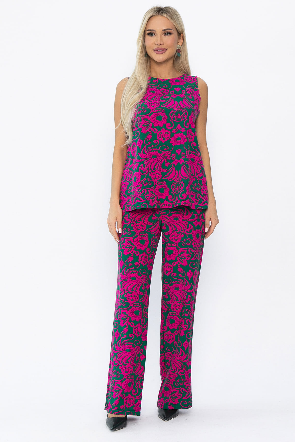 Костюм представляет собой гармоничный ансамбль, состоящий из блузы свободного кроя с круглым вырезом и брюк прямого кроя на удобной резинке по талии. Мягкая и дышащая ткань обеспечивает свободу движений и приятное ощущение на коже в течение всего дня. Идеален для летних вечеров, прогулок по городу или поездок на природу. Просто наденьте пару легких аксессуаров и обувь на плоской подошве, и ваше лето наполнится легкостью и стилем!