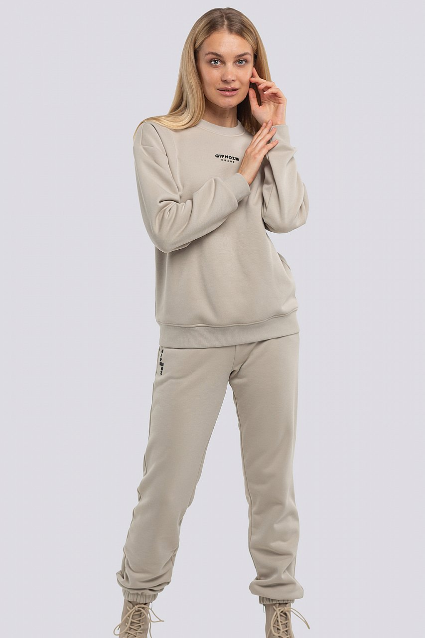 серо-бежевый Костюмы в спортивном стиле - это прекрасный вариант для шопинга, прогулки с подругой, поездки на природу или для полета на самолете. Они особенно комфортны и всегда согреют. Свитшот свободного кроя, спущенное плечо, низ изделия и низ рукава обработаны поясом и манжетами из кашкорсе. Брюки свободные, пояс и низ брюк на резинке. Модель украшена фирменным логотипом. Трикотаж утепленный на флисе, состав: 75% хлопок, 20% полиэстер, 5% спандекс.