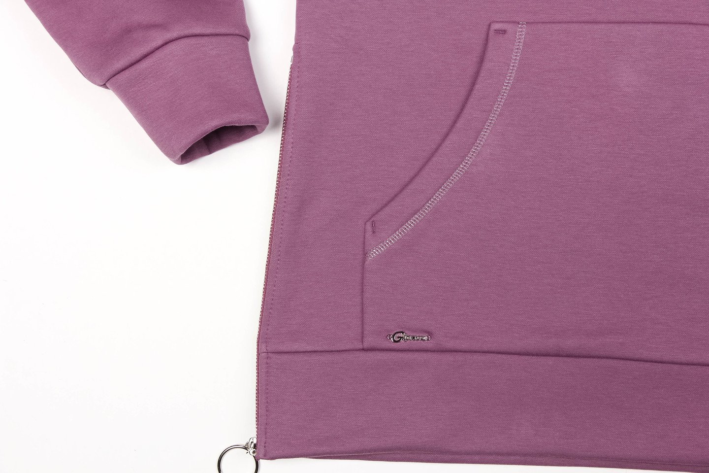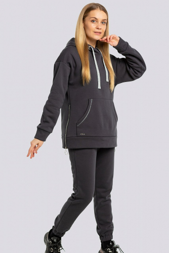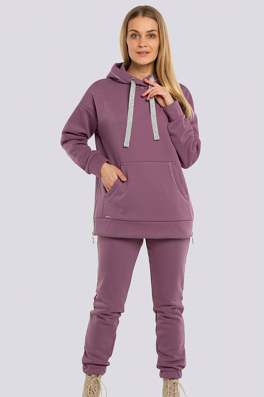 лиловый Это ещё один трендовый комплект, который выручит в любой ситуации. Спортивный и в то же время женственный костюм. С боков украшен металлическими молниями. На переде изделия карман. Брючки на резинке по поясу и по низу. На бедрах карманы. В капюшон вставлена серебристая тесьма. Трикотаж утепленный на флисе, состав: 75% хлопок, 20% полиэстер, 5 % спандекс.