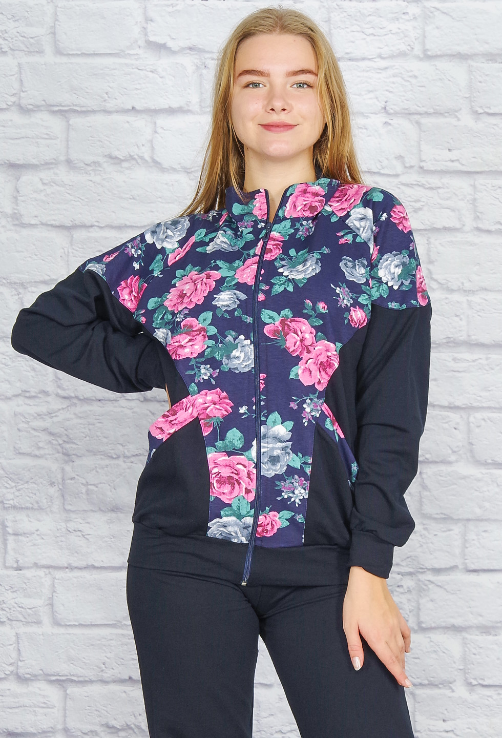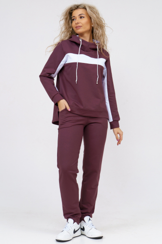 Стильный и удобный костюм из футера с лайкрой. Олимпийка комбинированная, застёжка молния, воротник-стойка, рукава и пояс на манжете, глубокие накладные карманы. Брюки однотонные прямого кроя, пояс на резинке.