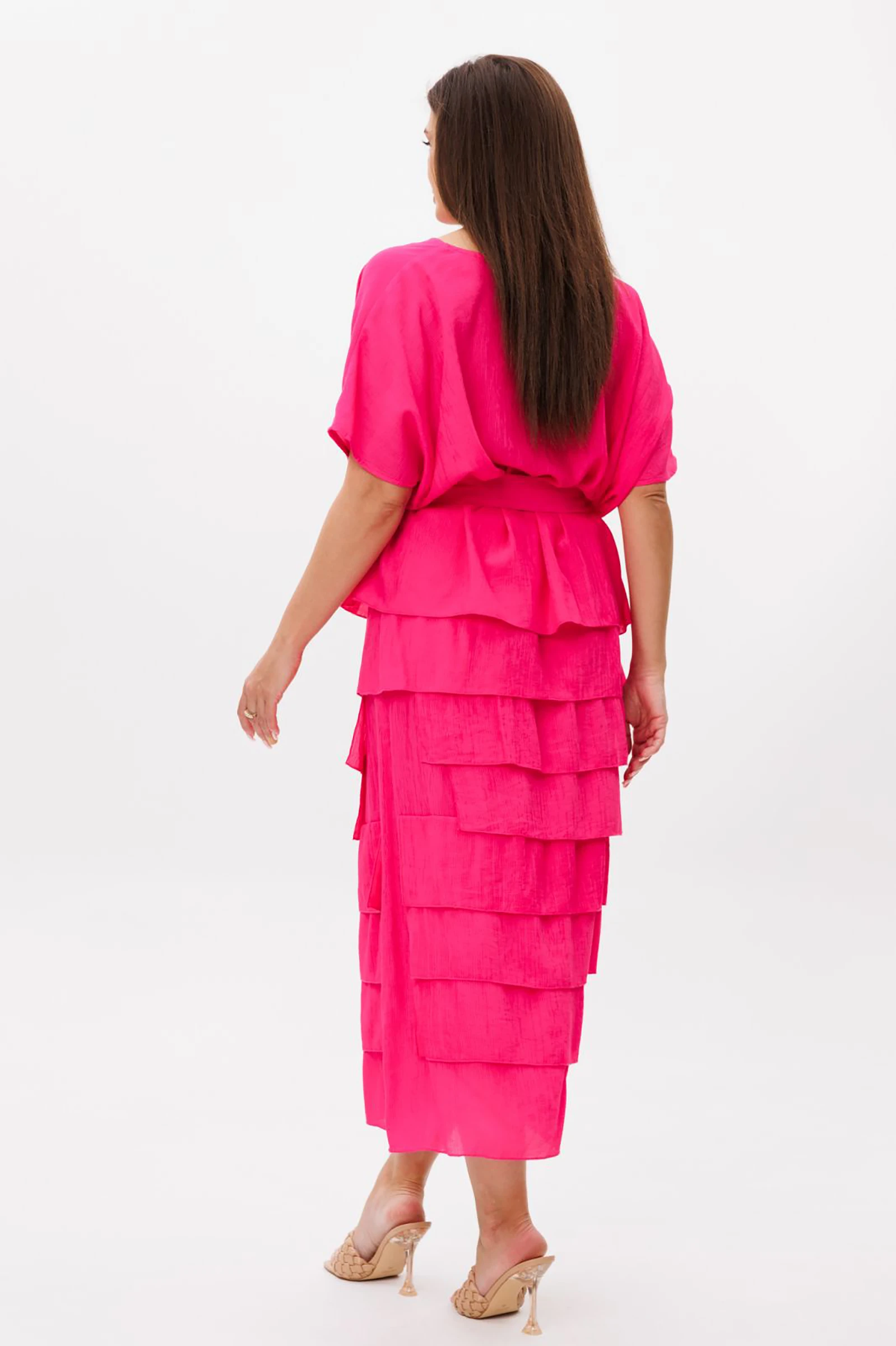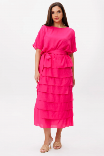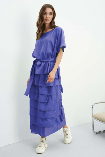 Казалось бы, лучшая одежда для тёплого лета - это платье, сшитое из лёгкой ткани, однако, по сравнению с платьем или сарафаном, комплект имеет преимущества, которые сложно оспорить. Во-первых, хорошая комбинаторность. Вы легко можете сочетать вещи комплекта с другими предметами гардероба - футболками, брюками, топами. Во-вторых, комплект умело скрывает недостатки телосложения, при этом подчёркивает женственность, являясь более практичной одеждой. Комплект состоит из свободной бузы и юбки. Блуза с расширенной линией горловины цельнокроенного покроя с коротким рукавом, широкая по форме с прямой линией низа. Юбка на широком притачном поясе с удобной эластичной лентой внутри и застёжкой на потайную тесьму - молнию сбоку. И поскольку многослойность сейчас в тренде - переднее с заднее полотнище юбки выполнено в виде настрочных асимметричных воланов без сборки - что даёт нужный правильный эффект без оптического увеличения объёмов. Комплект дополнен широким мягким поясом, который по Вашему желанию подчеркнёт линию талии. Длина блузы по спинке около 56 см, длина юбки около 89 см.