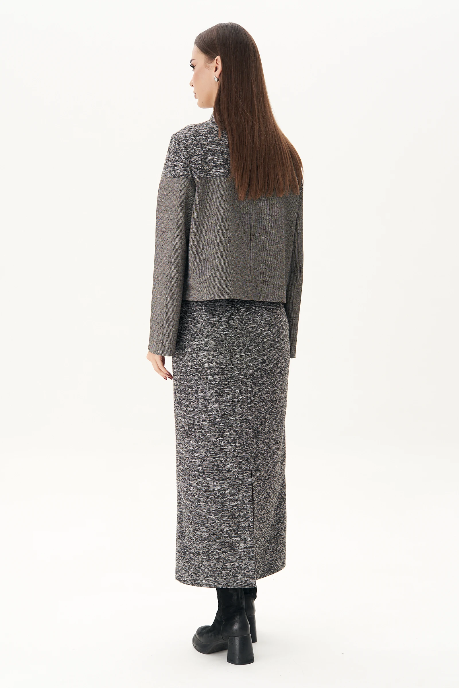 Особую привлекательность моделям даёт сочетание разнофактурных материалов. Вариант слегка укороченного верха с монохромным низом несёт визуальную простоту, элегантность и подчёркнутую женственность.Юбка прямая, длинная, из трикотажного полотна на нейлоновой подкладке, с высокой шлицей по спинке. Пояс с эластичной тесьмой, застёжка по центру спинки.Жакет комбинированный из разных полотен. Мягкий уютный трикотаж в верхней части и комфортный текстиль в нижней. Силуэт упрямлённый, покрой втачной, воротник-стойка. Полочки с большими накладными карманами с клапаном и имитацией застёжки на пуговицы. Спинка со средним швом.Длина жакета около 52 см, длина рукава около 60 см.Длина юбки около 90 см.