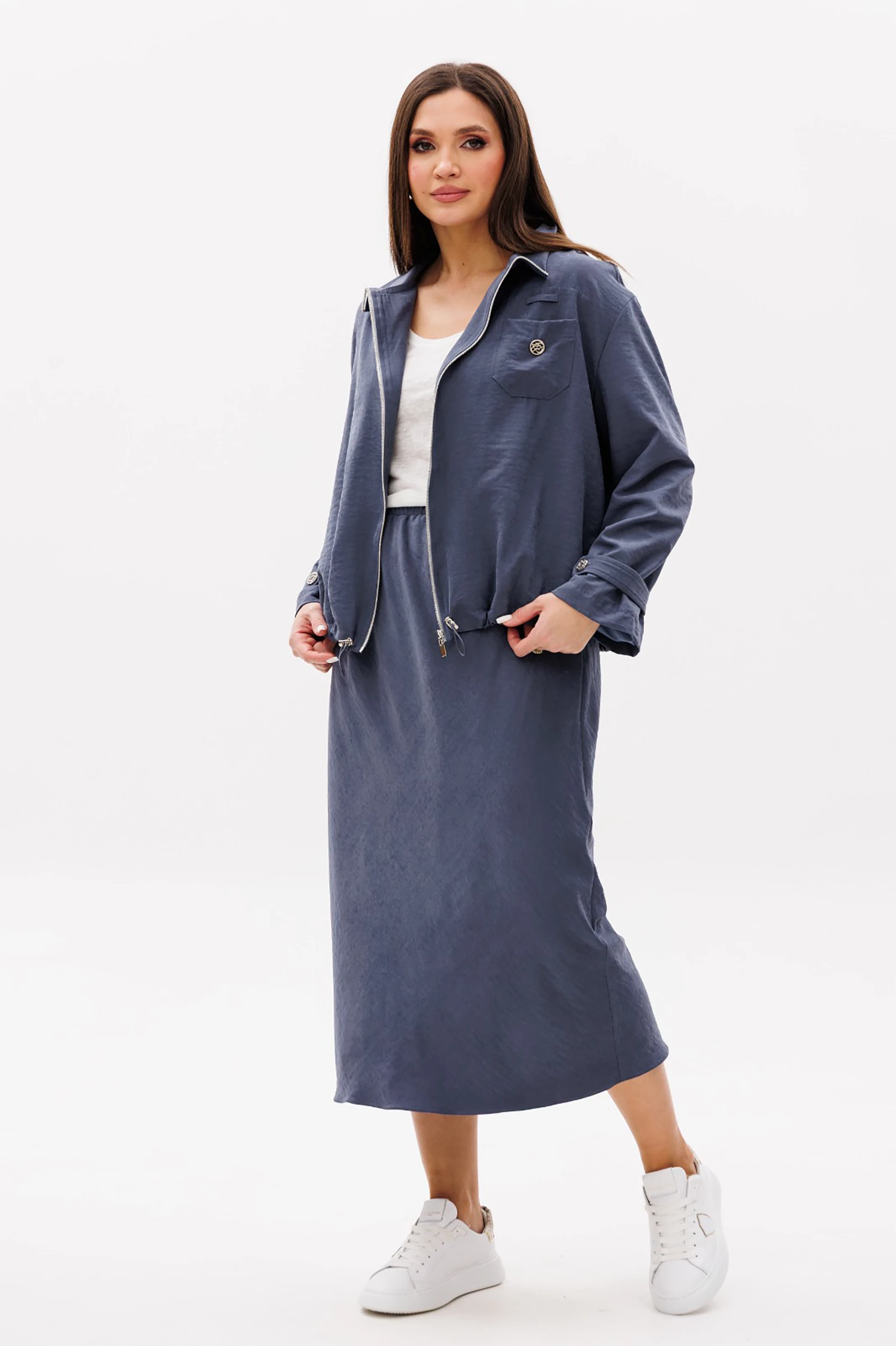Этот вариант комплекта практически универсален, поскольку одинаково хорошо подойдет и молодым девушкам и леди элегантного возраста. Для тех, кто ищет комфортную повседневную одежду, интересную и привлекательную, модель просто идеальна. Свободная куртка на подкладке и юбка, косого кроя, из невероятного полотна с эффектом "бархатистости" или в народе "мокрым эффектом". Куртка свободного силуэта, рубашечного покроя с воротником-стойкой и центральной застежкой на тесьму-молнию. Полочка с накладным карманом в области груди. Рукав с патой на пуговице в нижней части. По низу куртки-кулиса, с эластичной тесьмой и фиксаторами. Юбка на подкладке, косого кроя, с застежкой по боковому шву на потайную молнию и пуговицу и эластичным притачным поясом.