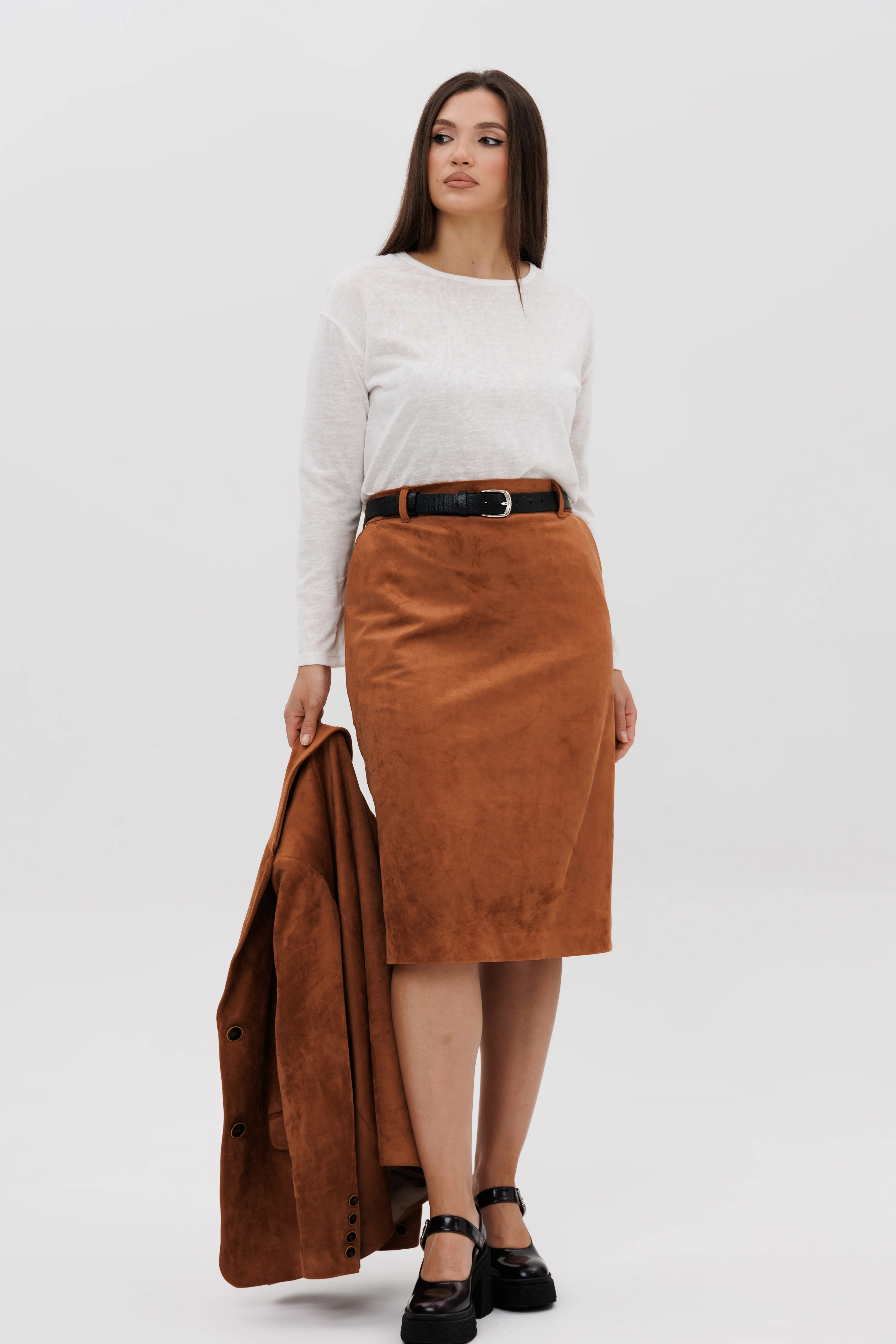 Осень меняет нам гардероб, хочется чего-то нового, свежего, необычного... И это повод, обзавестись костюмом из замши. Замша-главный хит 2025г. Он всегда смотрится эффектно, особенно если одеться в нее с головы до ног. Отличным выбором станет юбочный костюм.