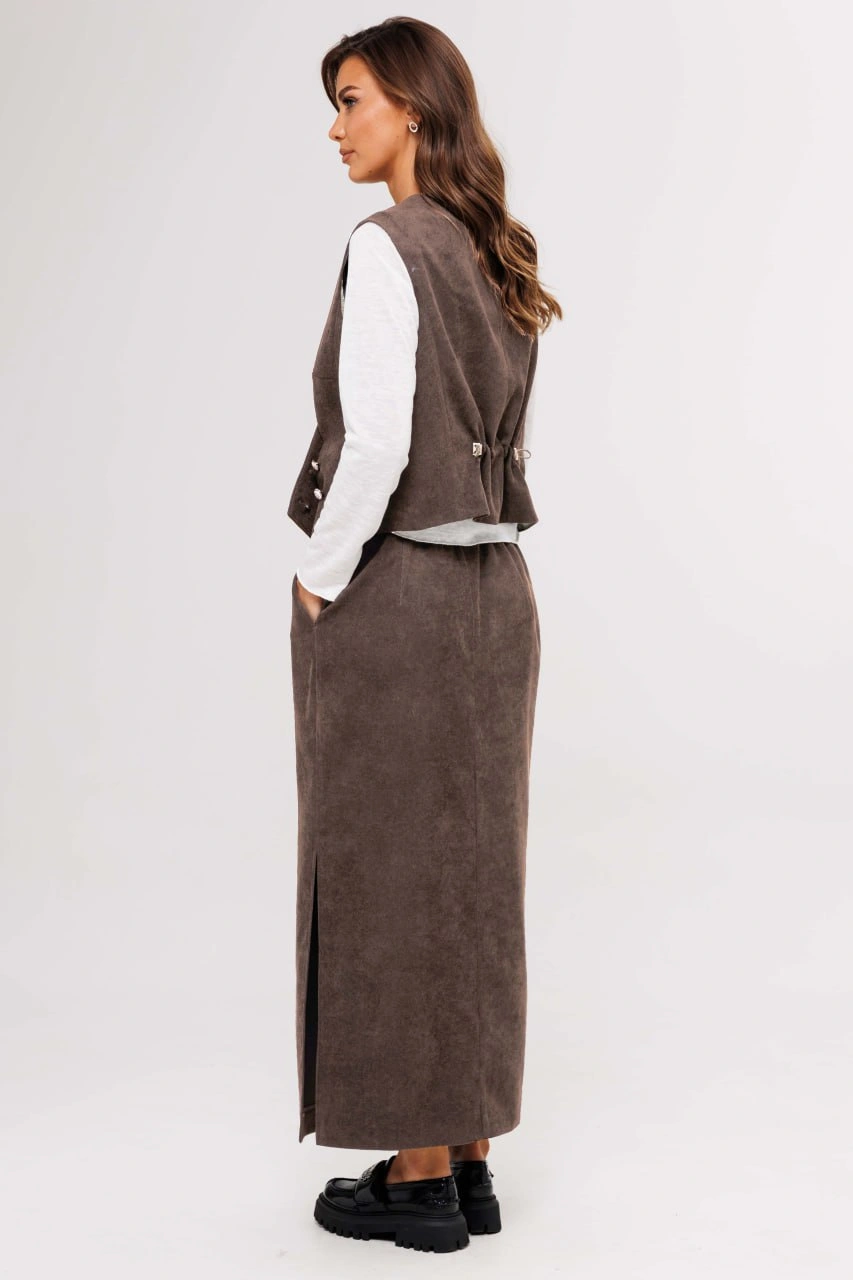 Юбка прямая с застёжкой и боковыми карманами по переднему полотнищу, и разрезом сбоку, из текстильного трикотажного полотна эффекта "вельвет". Пояс эластичный в области спинки.