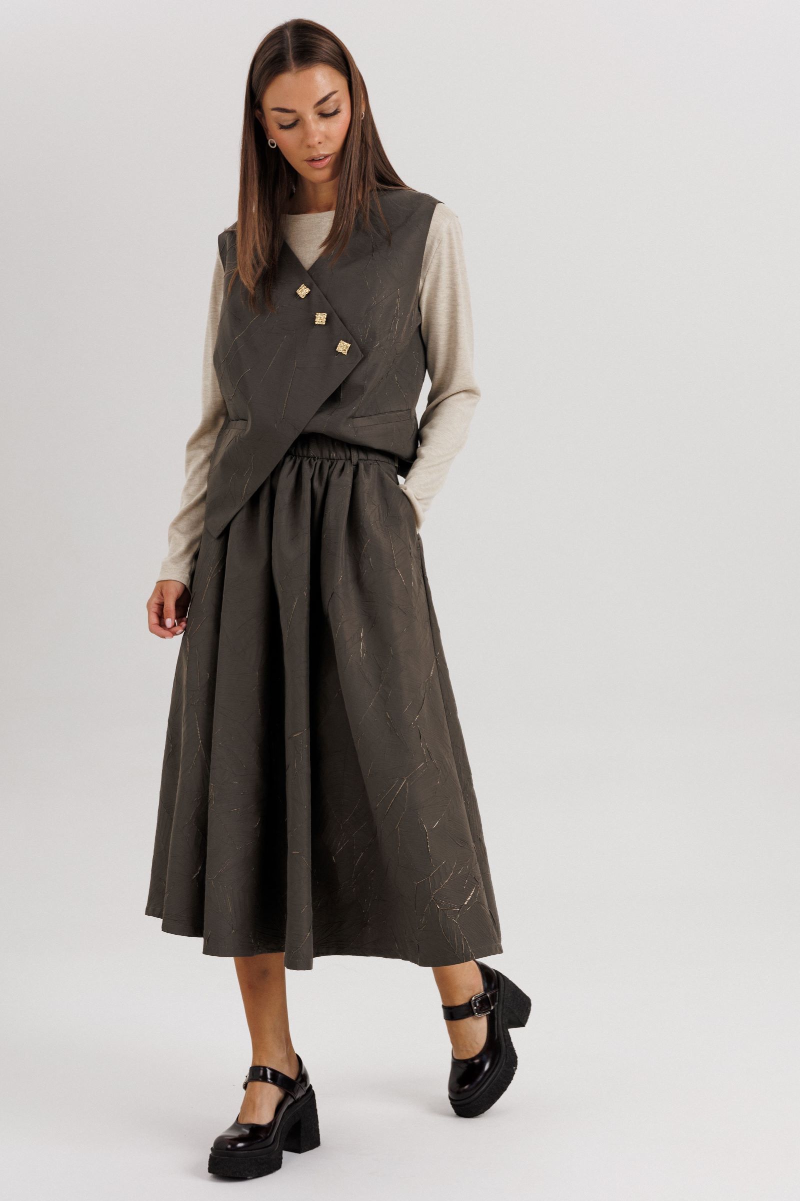 Жилет выполнен из плотной фактурной ткани с декоративной асимметричной застёжкой на пуговицы — этот элемент придаёт образу динамичность и оригинальность. Юбка длиной миди с мягкими складками красиво драпируется и подчеркивает женственность силуэта. Лонгслив из мягкого трикотажа обеспечивает комфорт и добавляет легкости всему ансамблю.