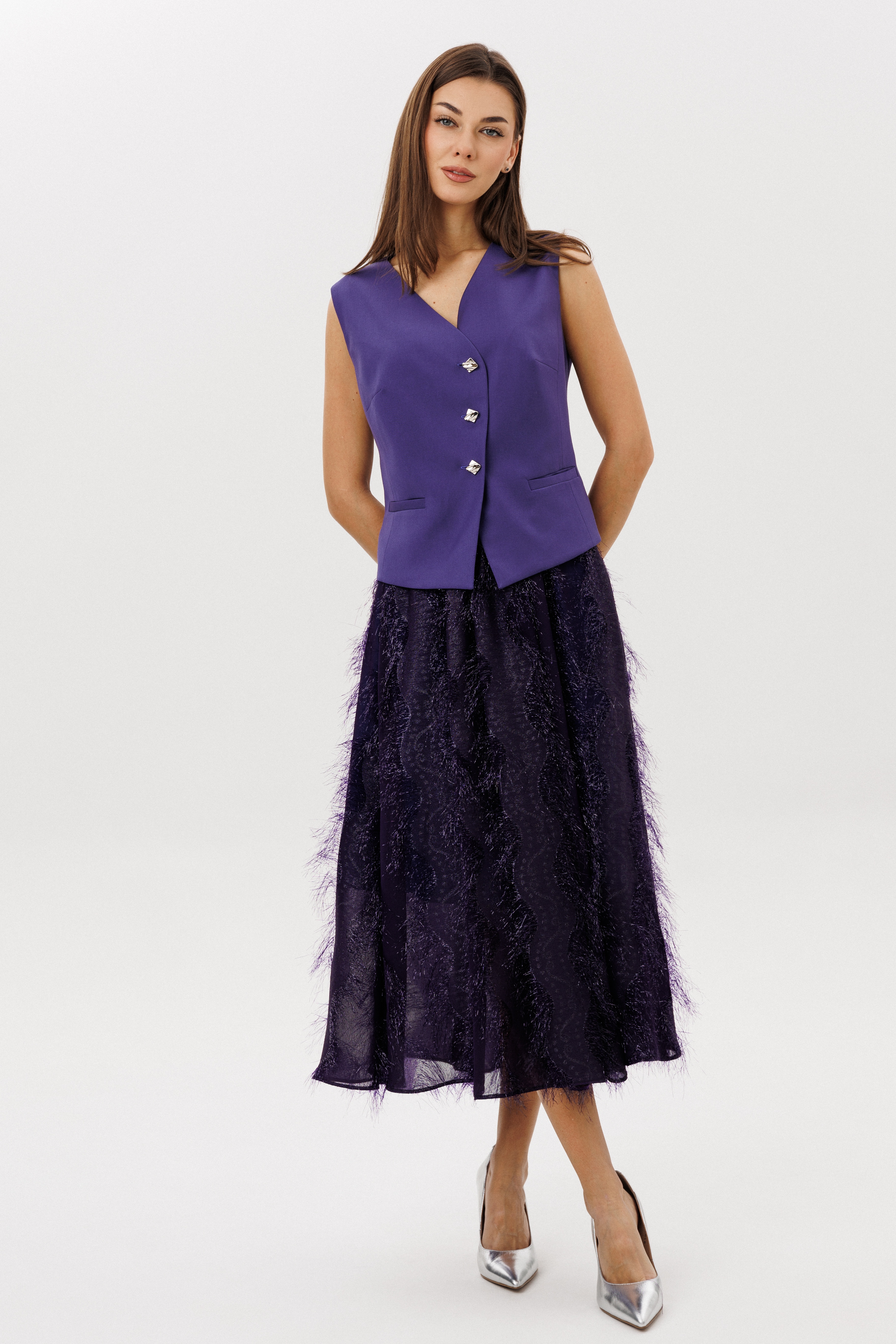 Актуальный комплект, в котором строгая геометрия жилета гармонично сочетается с романтичной женственностью многослойной юбки. Лёгкий шифон с фактурным переливом делает образ выразительным и праздничным, а продуманная посадка юбки обеспечивает красивую линию талии и динамику силуэта.