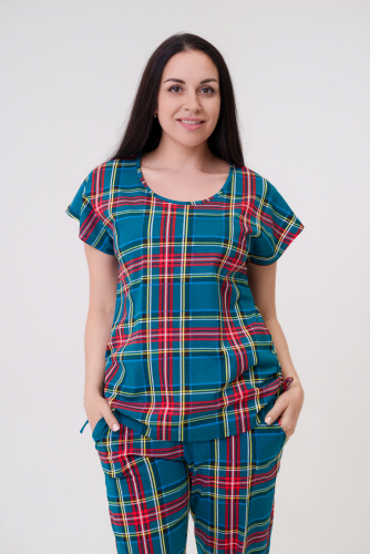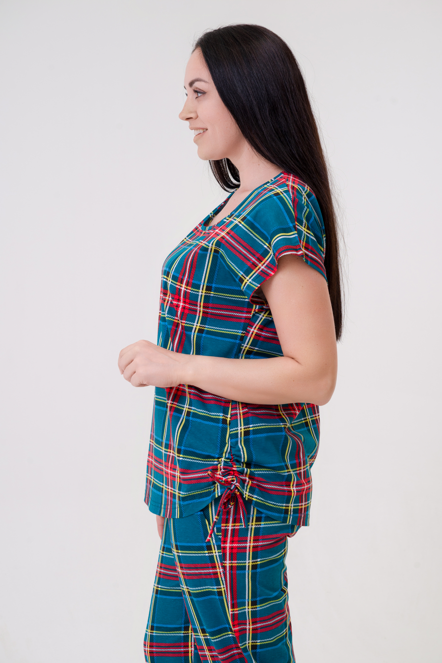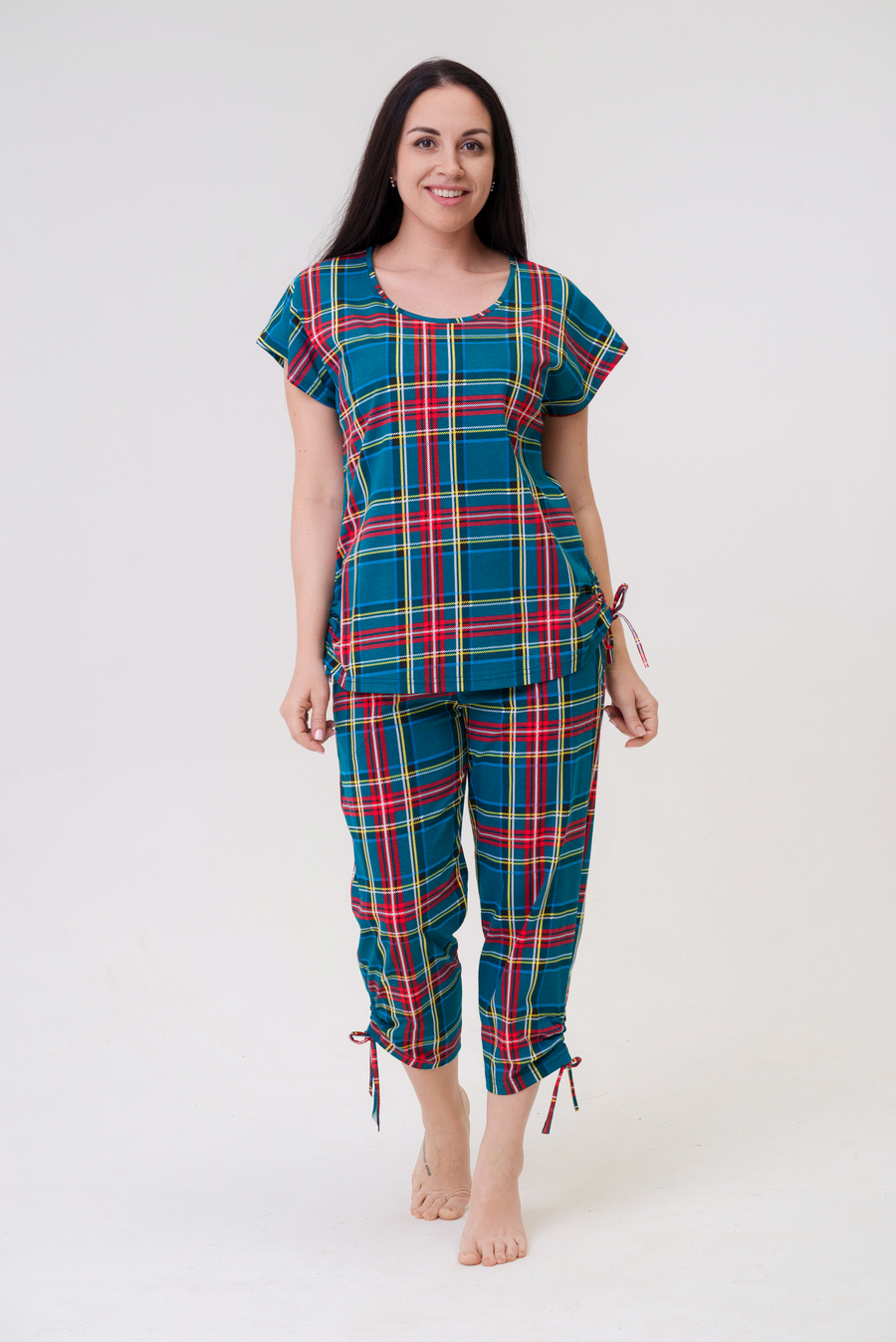 Костюм женский из футболки и брюк из кулирки "Крым" зеленая клетка макси