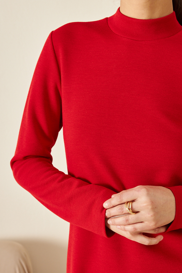 Платье из эластичного полотна. Изделие прилегающего силуэта с длинным втачным рукавом. Воротник-стойка. По среднему шву спинки застежка-молния.