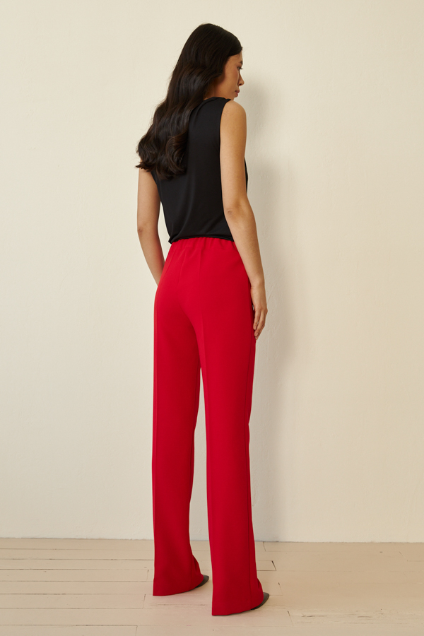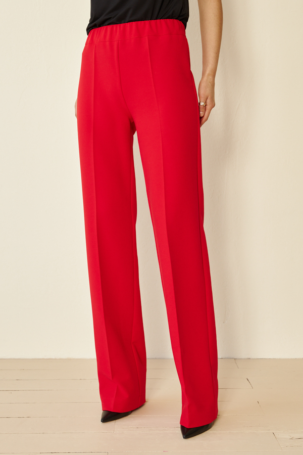 Брюки прямого силуэта из костюмной ткани. Пояс притачной с эластичной резиной.
