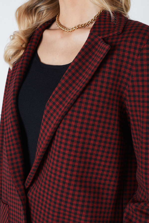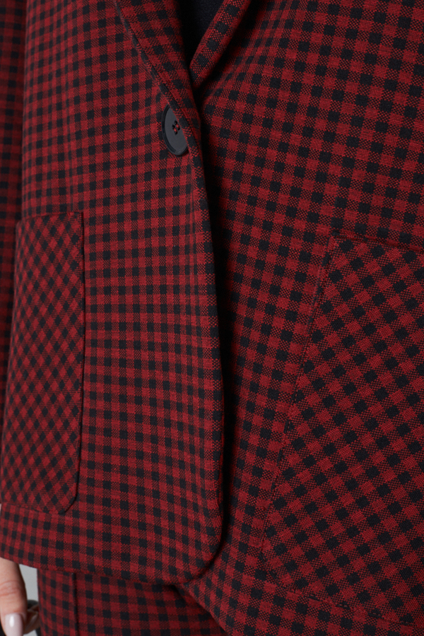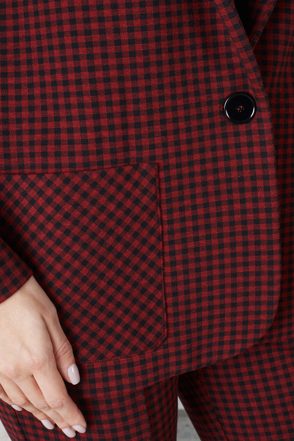 Жакет выполнен из эластичной ткани с жаккардовым узором "клетка". Изделие прямого силуэта с английским воротником, который визуально сделает фигуру стройнее и подчеркнет красивую линию груди. На передней части жакета застежка на пуговицу и накладные карманы. Втачной длинный рукав. Изделие с плечевыми накладками, которые при желании можно убрать.