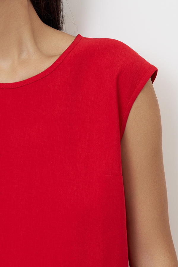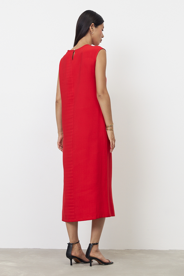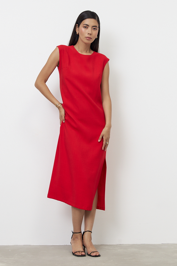 Платье из вискозной ткани с крэш-эффектом. Полуприлегающий силуэт, с разрезом в боковом шве. По среднему шву спинки застёжка на петлю-пуговицу. Круглый вырез горловины и линия проймы окантованы косыми бейками из основной ткани.