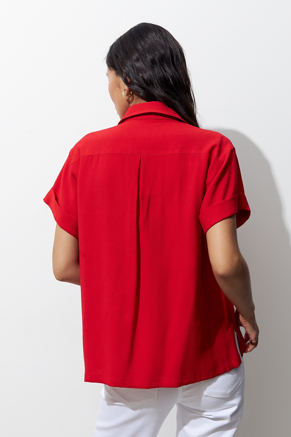 Рубашка из вискозной ткани с крэш-эффектом. Свободный силуэт с разрезами в боковых швах и застёжкой на планке. Вырез горловины обработан отложным воротником на стойке. Короткий рубашечный рукав с отворотом. На задней части изделия выполнена кокетка с небольшой складкой. На передней-накладной карман в области груди.