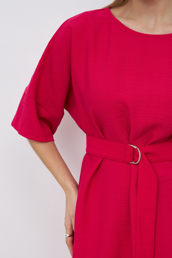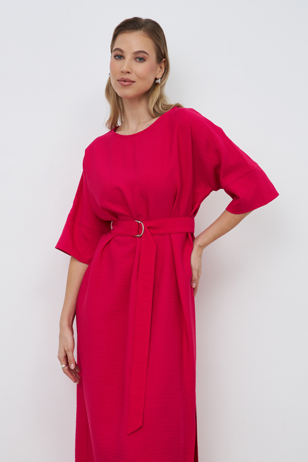 Платье из вискозной ткани с крэш-эффектом. Свободный силуэт, с разрезом в боковом шве. Круглый вырез горловины окантован косой бейкой из основной ткани. Цельнокроеный рукав с притачной манжетой. В комплекте пояс из основной ткани. В таблице размеров представлены параметры человека, а не изделия.
