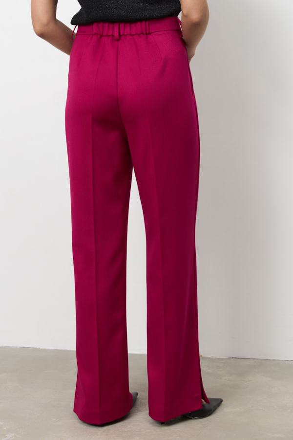 Брюки из костюмной ткани прямого силуэта с разрезами в боковых швах. Застёжка на молнию-гульфик и пуговицу. Притачной пояс со шлёвками. Задняя часть пояса с резиной, что обеспечивает хорошую посадку по фигуре.