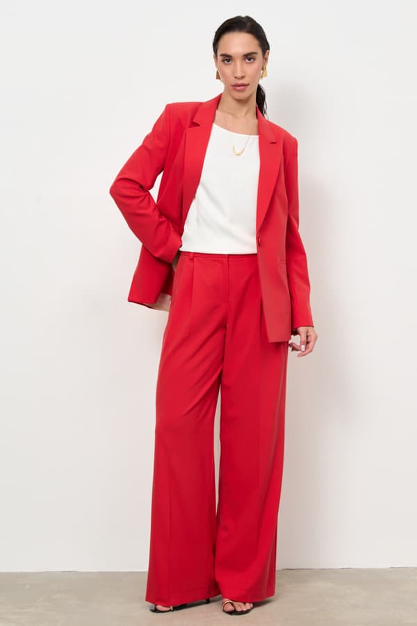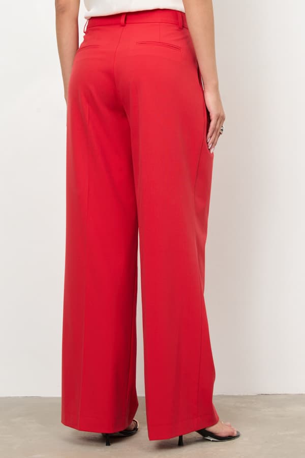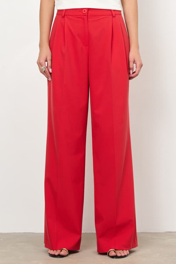 Брюки из костюмной ткани свободного силуэта. На передней половинке выполнены карманы с подкройным бочком, по линии талии заложены складки. На задней половинке — талиевые вытачки и имитация карманов в рамку. Притачной пояс со шлёвками. Застёжка на молнию-гульфик и пуговицу. Такой крой выгодно подчеркнёт длину ваших ног.