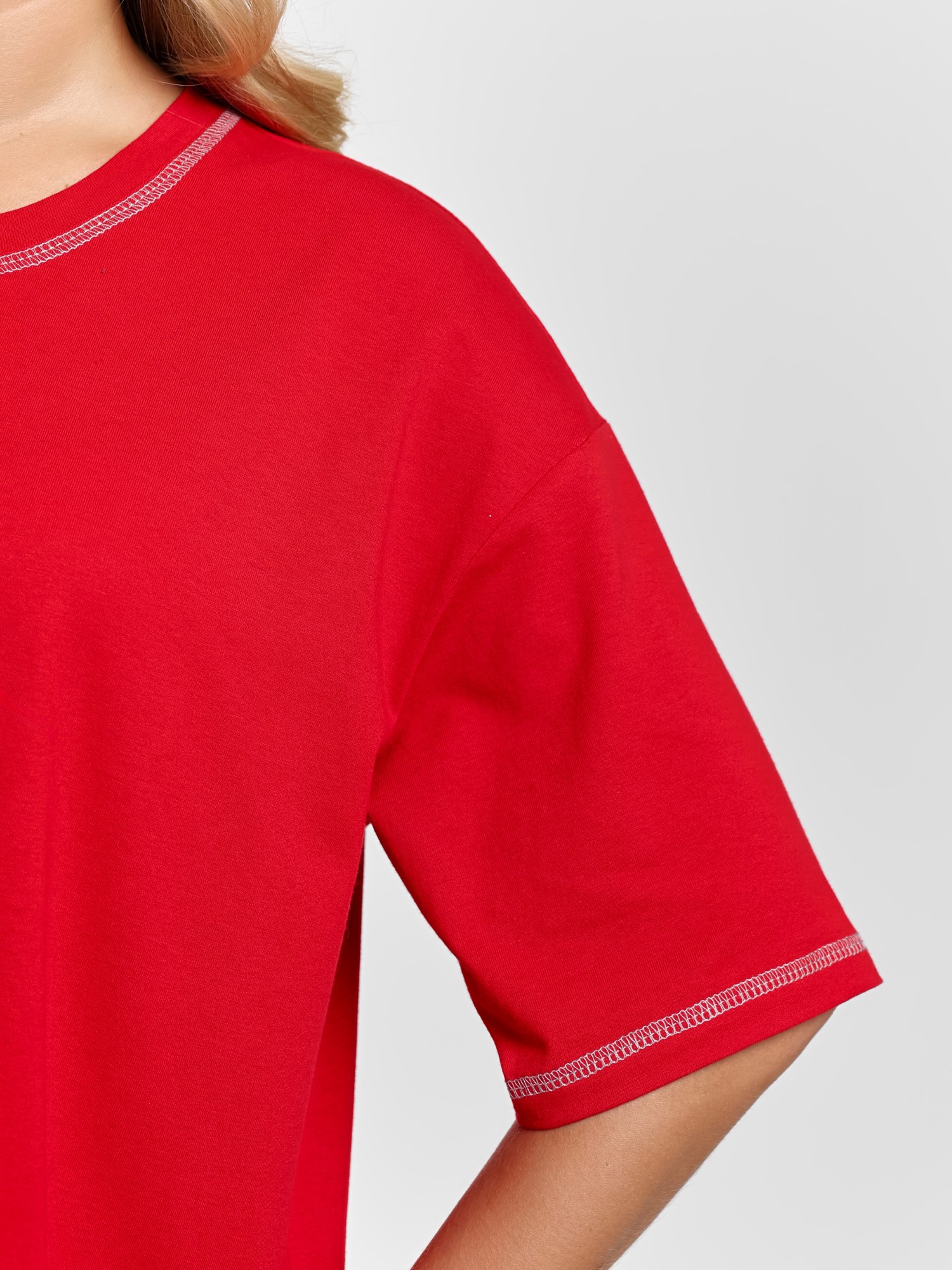 Костюм женский из трикотажного полотна "кулирка" в комбинации двух видов: гладкокрашенного красного цвета и с набивным тематическим рисунком на сером фоне , состоящий из футболки и брюк. Футболка - модного силуэта, слегка укороченная свободного покроя, с приспущенным плечом, с втачными рукавами длиной до локтя, горловиной овальной формы, обработанной втачной планкой и принтом в центре переда. По шву втачивани я планки настрочена декоративная (5-ниточная) отделочная строчка нитками контрастного цвета Подгибка низа рукавов и изделия так же выполнена с применением декоративной отделочной строчки. Брюки выполнены из полотна с набивным темкатическим рисунком, длинные, умеренной ширины, прямые, с эластичной тесьмой по талии.