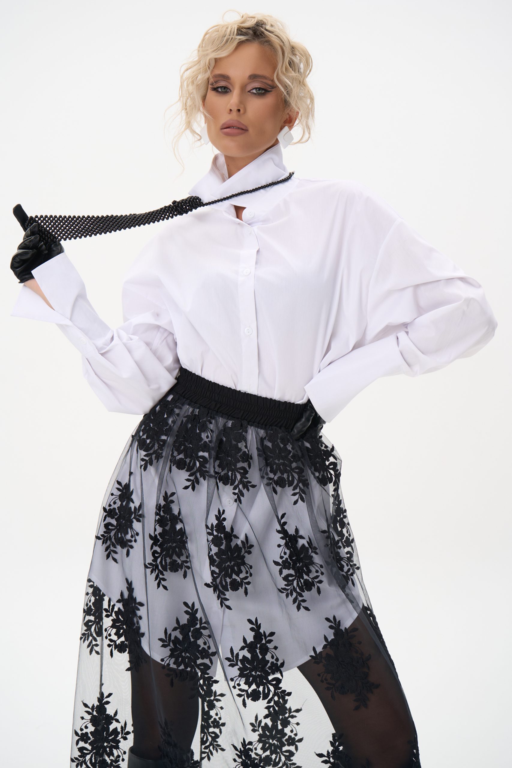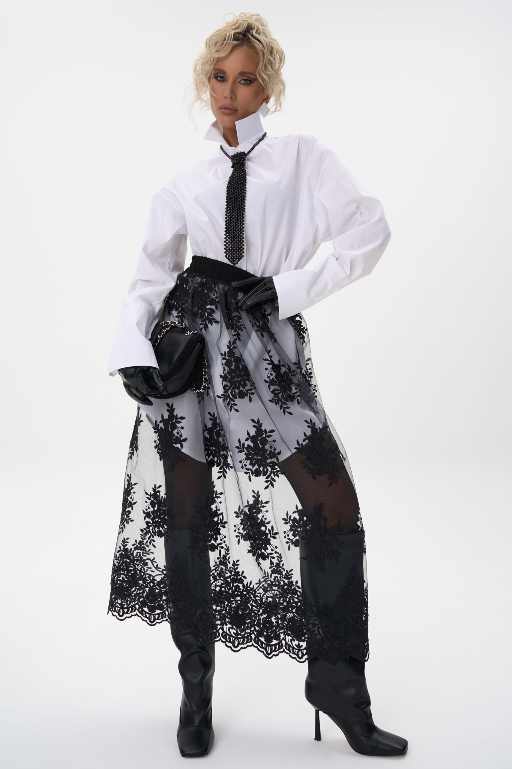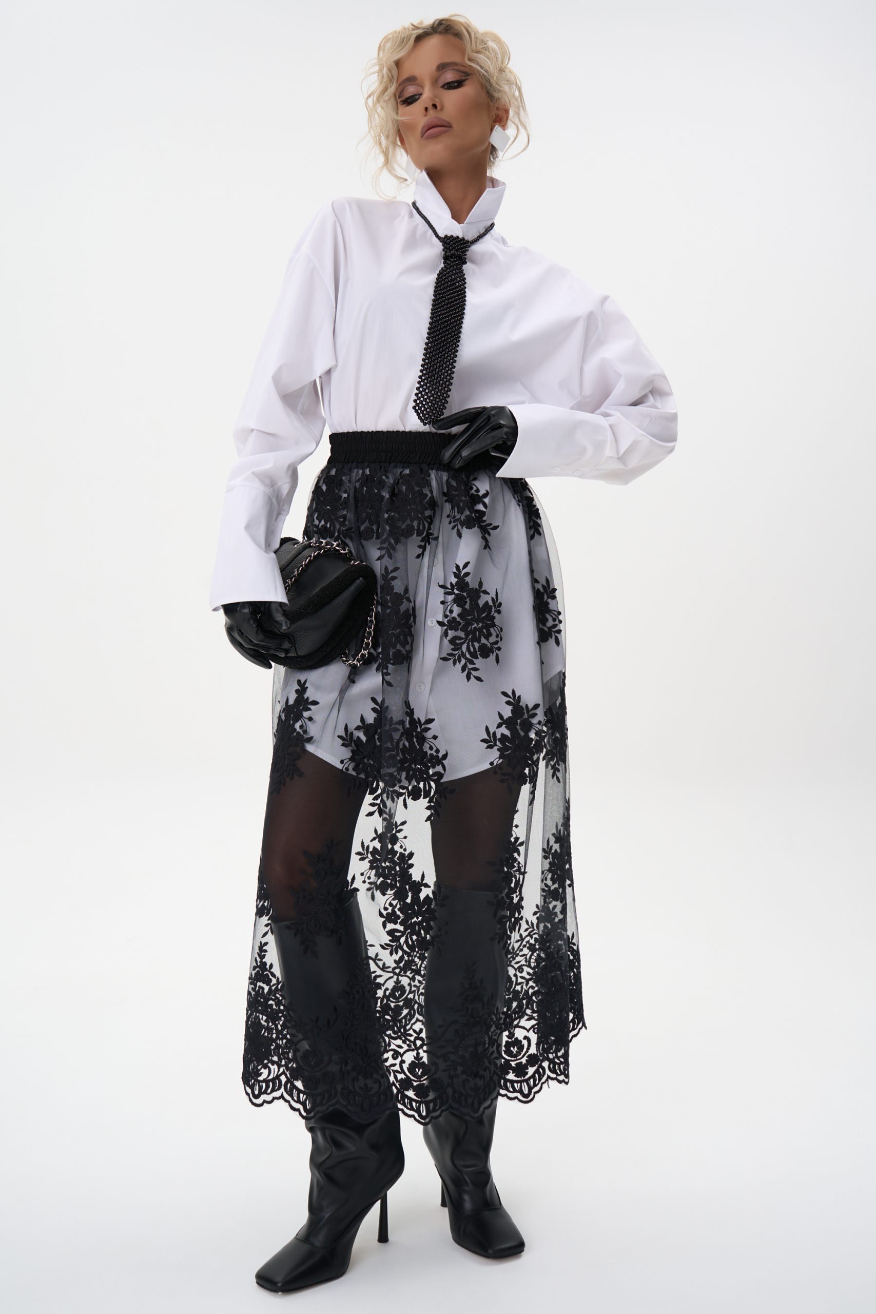 Юбка длины миди на высокой посадке, выполненная из прозрачного кружева. Для создания комплекта сочетайте ее с платьем “Мейдж”, платье-рубашка “Пэрис” , платье “Лола”.